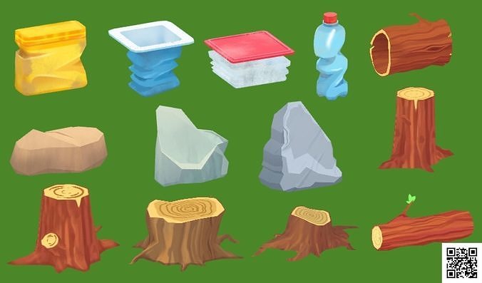 Stylized cartoon rocks, snags, stumps, and trash for your project.