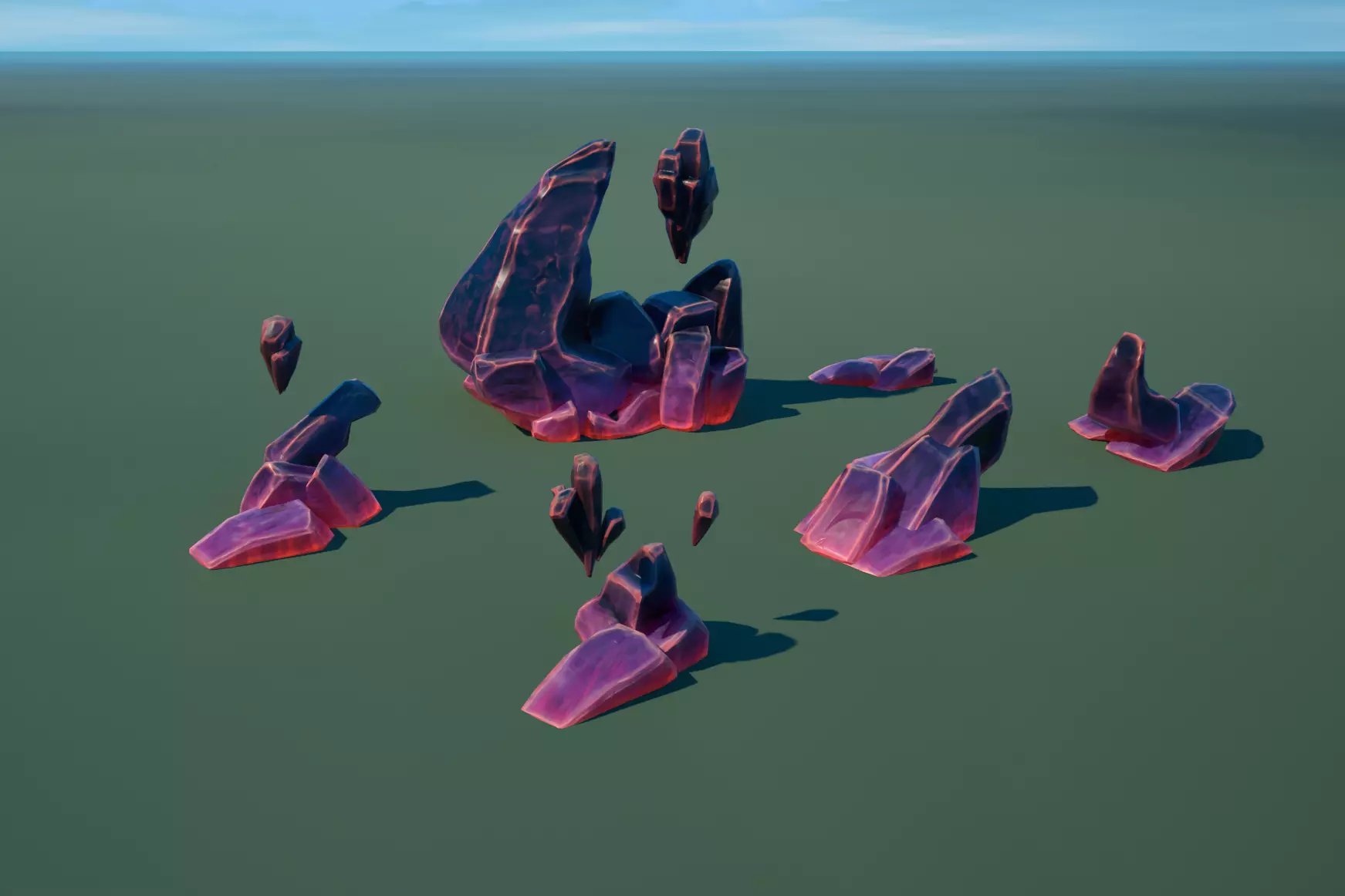 The crystals emit an ethereal glow with subtle color gradients, ideal for games, animations, or VR experiences. Their jagged, organic shapes and floating fragments create a sense of ancient magic and mystical energy, perfect for setting the tone in magical forests, alien planets, or cursed ruins.