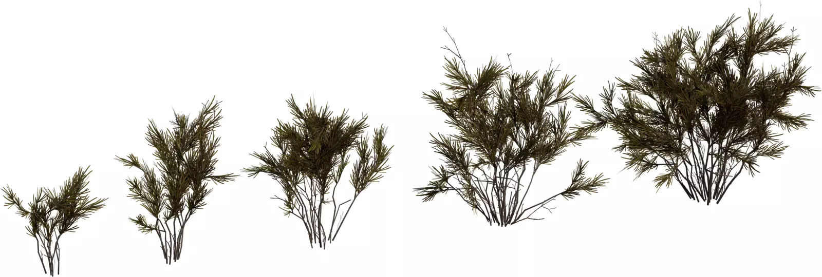 This pack offers five variations of stylized rosemary‑like shrubs with thin woody stems and dense needle clusters, ideal for Mediterranean gardens, herb planters, or rocky hillsides. Each model progresses from a small sprig to a full mature bush, allowing natural variation when scattering them in larger environments. Geometry is optimized with efficient branch structures and foliage cards, keeping the assets lightweight for real‑time engines while still reading clearly in close‑up renders. PBR textures include color, roughness, and normal maps that capture subtle tint shifts between green and brown needles plus bark detail on the stems. UVs are cleanly unwrapped and share consistent texel density, making material edits and LOD creation straightforward in major DCC tools and game engines. These shrubs work well as ground‑level decor, planter herbs, or low bushes in stylized and semi‑realistic outdoor scenes.