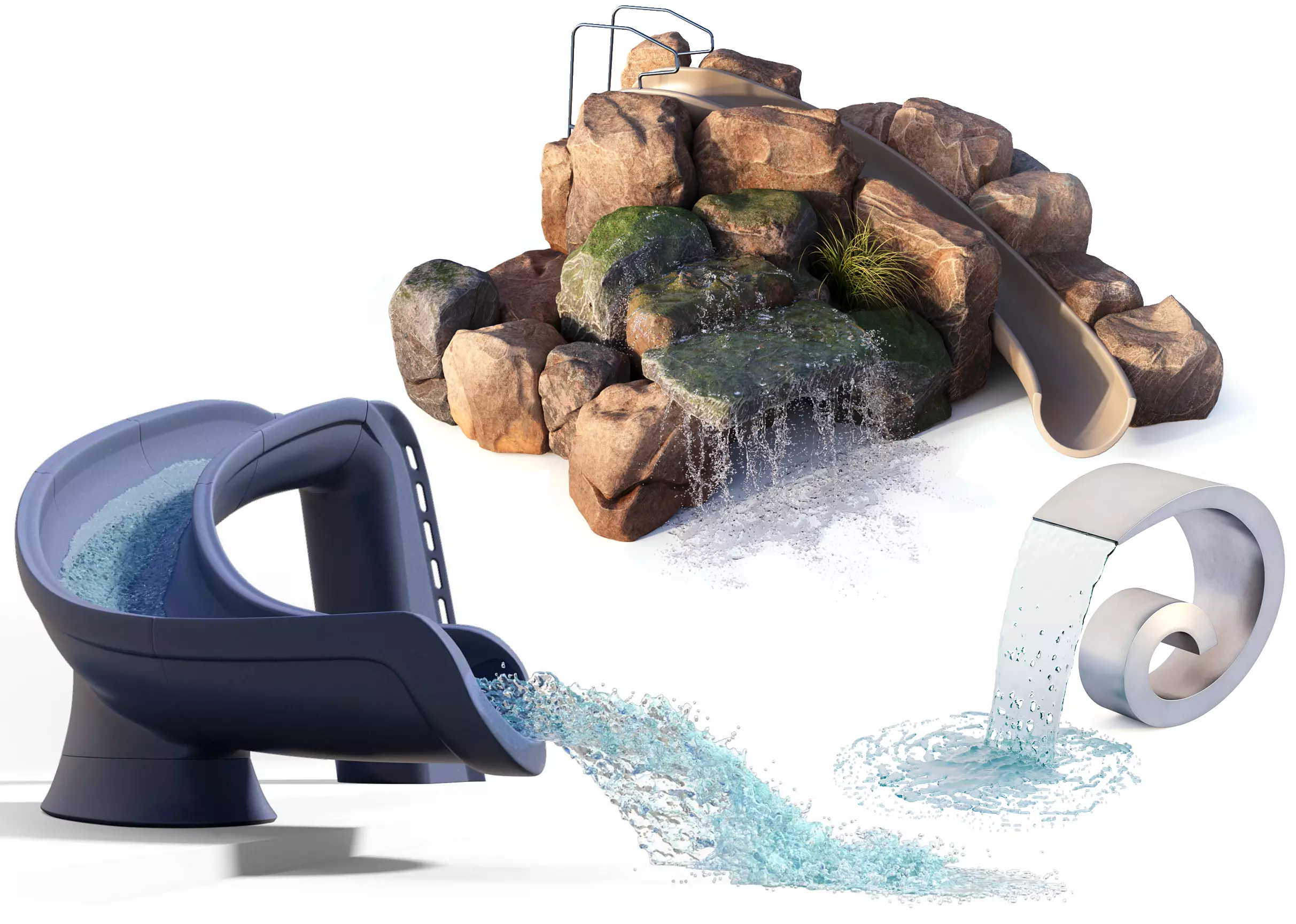 Modern Curved Water Slide: A sleek, contemporary poolside slide with a smooth finish and realistic water exit effects.