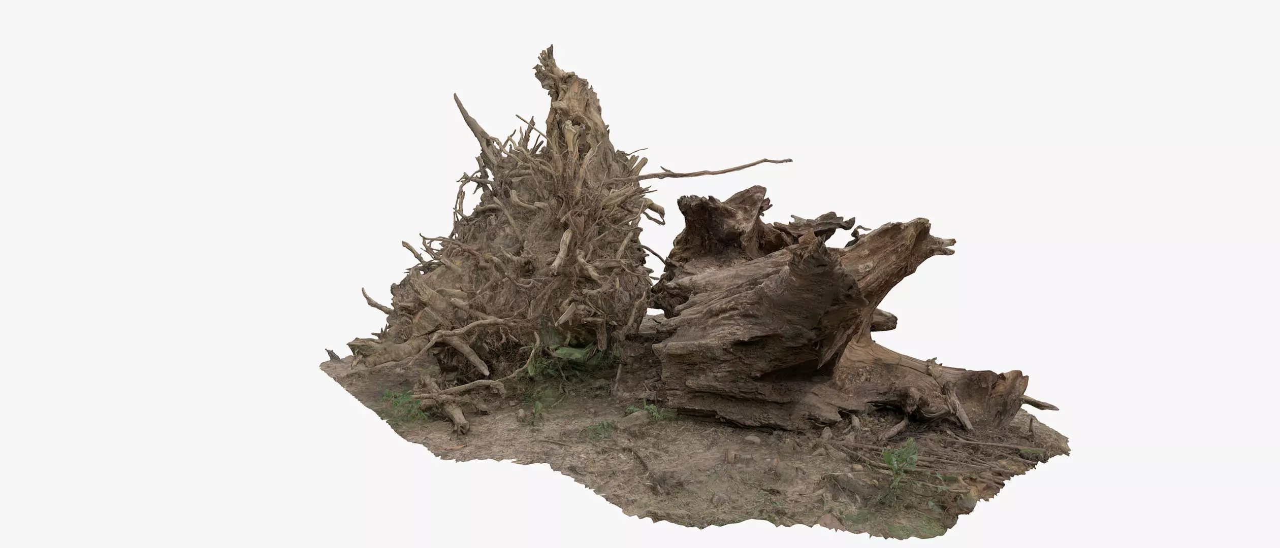 Dry desert arid ground soil cut with three bunch of torn out tree stump sstumps stree upside down