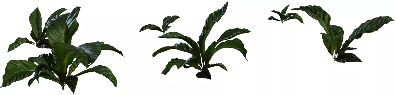 This pack contains several variations of lush, broadleaf tropical plants designed as low ground clumps for jungle, indoor planter, and courtyard scenes. Each model features long, slightly curled leaves with a glossy surface and strong central veins, giving a convincing sense of volume from both side and top views. The meshes are optimized with clean topology and moderate polygon counts, making them suitable for real‑time engines while still holding up in close‑up shots. PBR textures include color, roughness, and normal maps that capture subtle specular highlights and leaf shading for realistic response under different lighting conditions. Assets are UV‑unwrapped and grouped for easy import, material assignment, and instancing inside major DCC tools and game engines. These tropical leaf clumps work well as undergrowth, potted decor, or hero foliage accents in archviz, games, and cinematic environments.