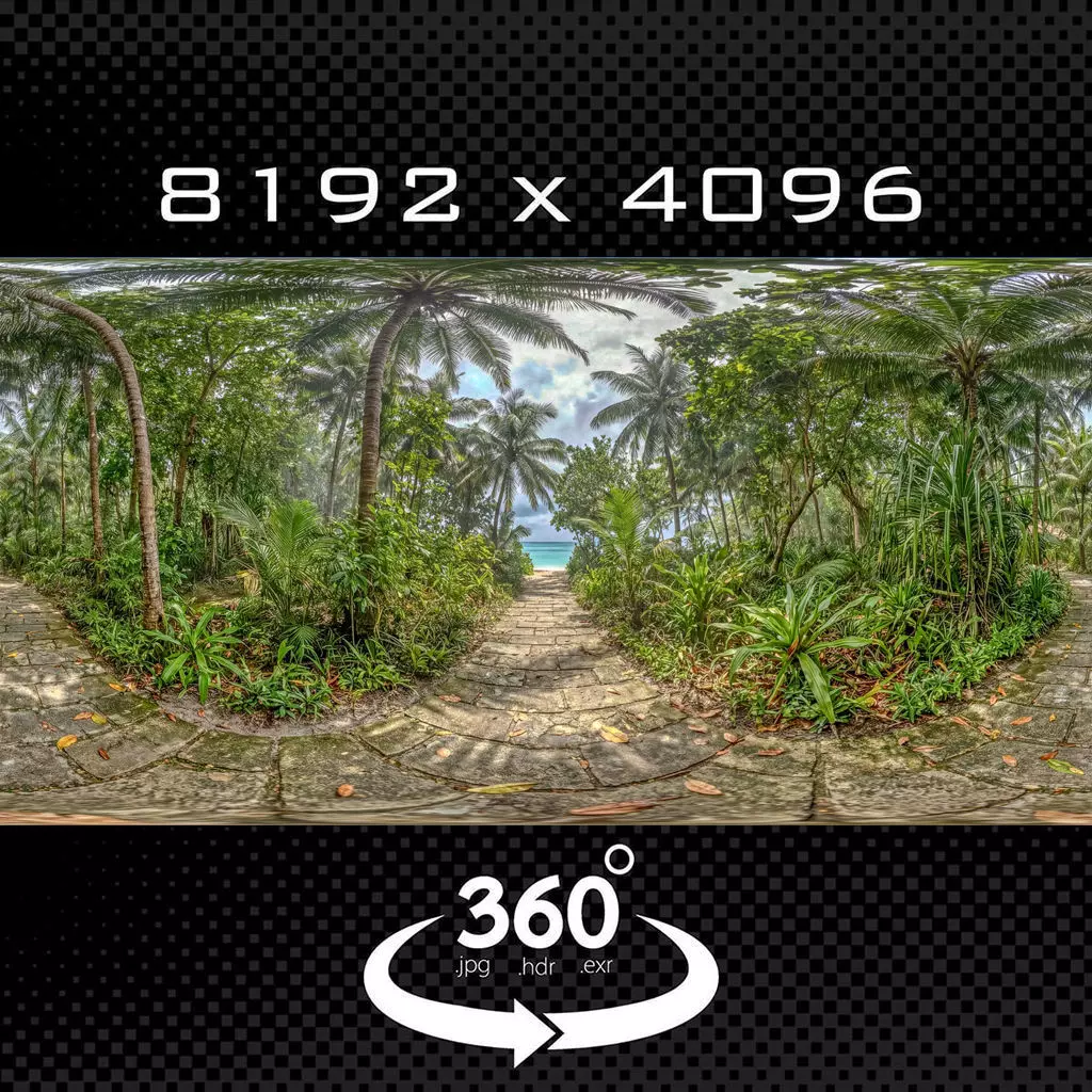 Premium 8K (8192×4096) equirectangular 360° HDRI of a lush tropical jungle beach path leading to pristine turquoise waters. Features a winding stone pathway surrounded by tall palm trees, dense green foliage, exotic plants, fallen leaves for realism, and a breathtaking ocean view with cloudy blue sky and distant horizon.