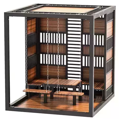 The model includes two suspended wooden swings attached with metal chains, a central wooden bench, and integrated side seating, making it ideal for social areas and contemporary outdoor environments. The modular side panels are designed with rhythmic vertical and horizontal slats, offering both privacy and controlled visibility while allowing natural light to pass through.