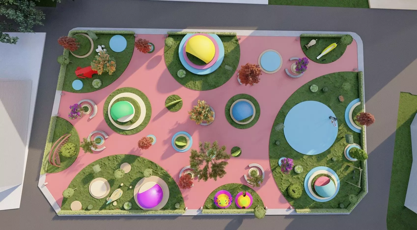 This 3D model showcases a contemporary urban playground designed with vibrant colors and dynamic shapes. The model features curved paths, abstract seating areas, and interactive installations perfect for outdoor spaces. The playful layout combines pink, green, and purple elements, creating a visually striking landscape. Ideal for architects and urban designers, this model emphasizes creativity in public spaces. Designed using Lumion for high-quality rendering, the model can be used for conceptual presentations, landscape design proposals, and public space projects. The organic flow of the paths and natural integration with greenery provides a perfect balance between form and function.
