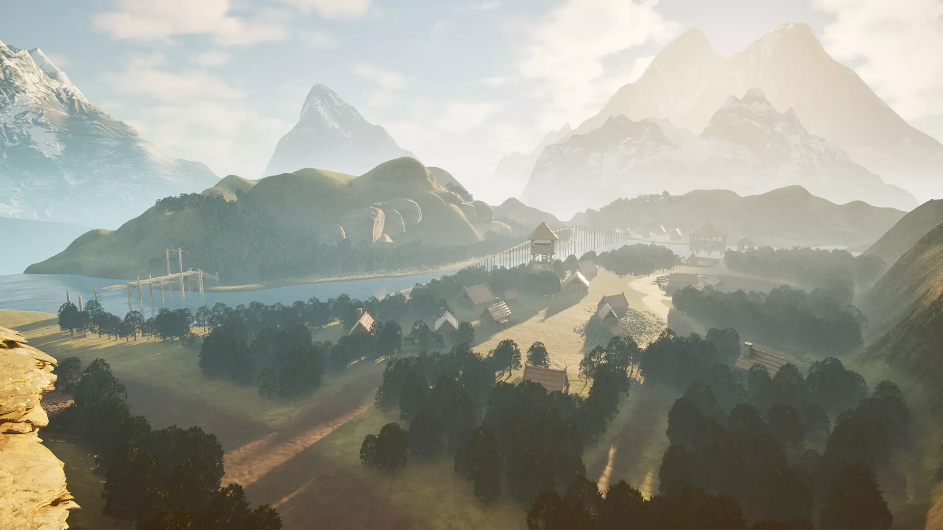 Key Features• Vibrant, Realistic Landscape: The scene features a large, reflective river flowing through a lush, green valley. Towering, snow-capped mountains provide a majestic backdrop, with a clear sky and soft, atmospheric lighting to create a sense of depth and tranquility.• Authentic Village Architecture: The pack includes a variety of wooden Nordic-style houses with thatched roofs, surrounded by simple fences and scattered across the rolling terrain. A prominent watchtower stands guard, offering a sense of community and security.• Detailed Natural and Structural Assets: A key highlight is the long suspension bridge that stretches across the river, connecting different parts of the environment. A rustic wooden dock and a small, inviting riverside hut add to the scene's charm and functionality. Other details include large, mossy rocks and a stone-ringed campfire, perfect for creating dynamic and engaging scenes.• Optimized for Performance: The environment is built with Unreal Engine's capabilities in mind, balancing high visual fidelity with smooth performance. The assets are designed to be modular and easy to use, allowing for quick and efficient level design.