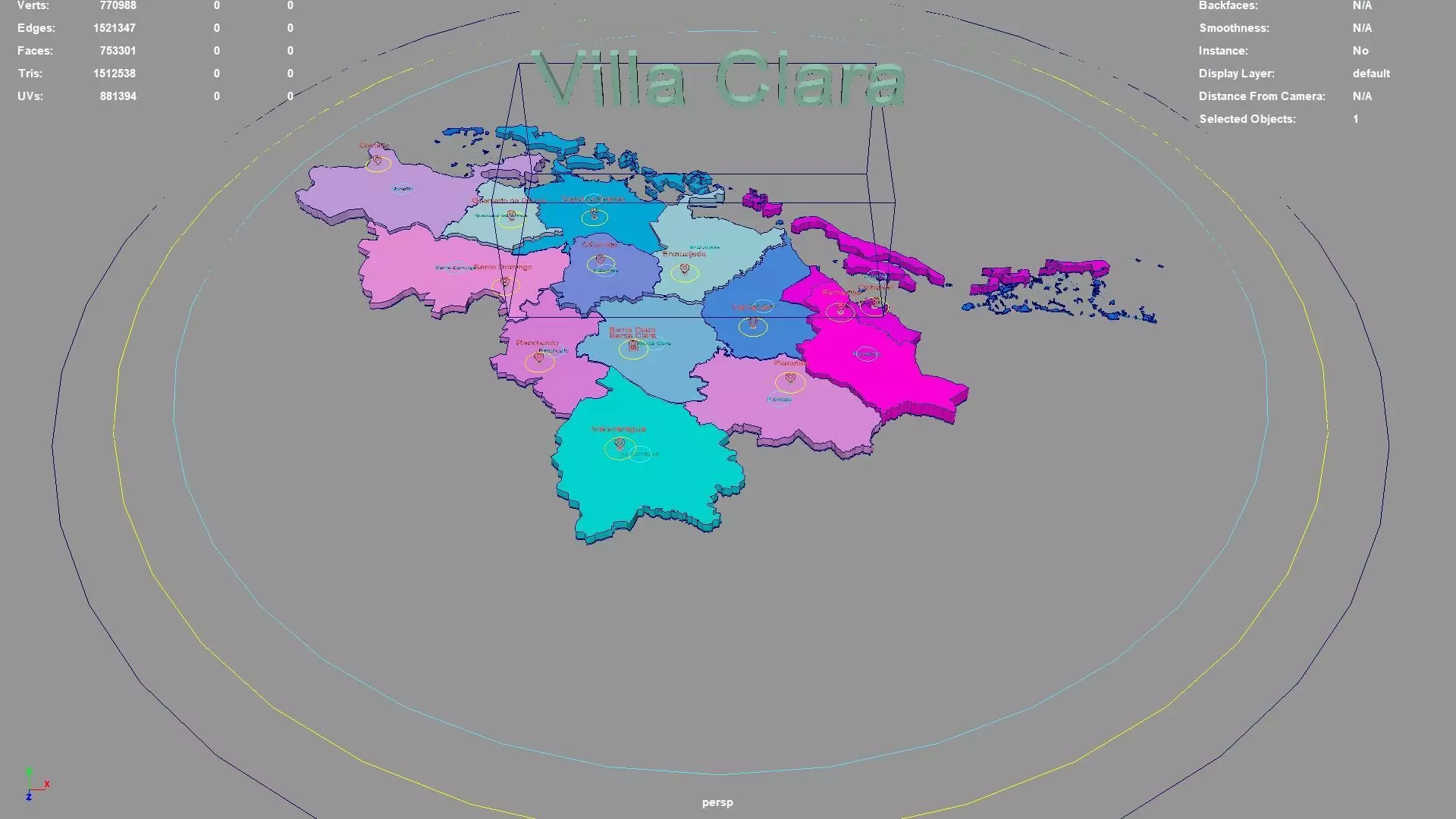 Villa Clara regions : The model is divided according to the administrative region of Villa Clara. Each region is clearly separated so you can easily isolate it or change the colors. Names are also editable and separate.