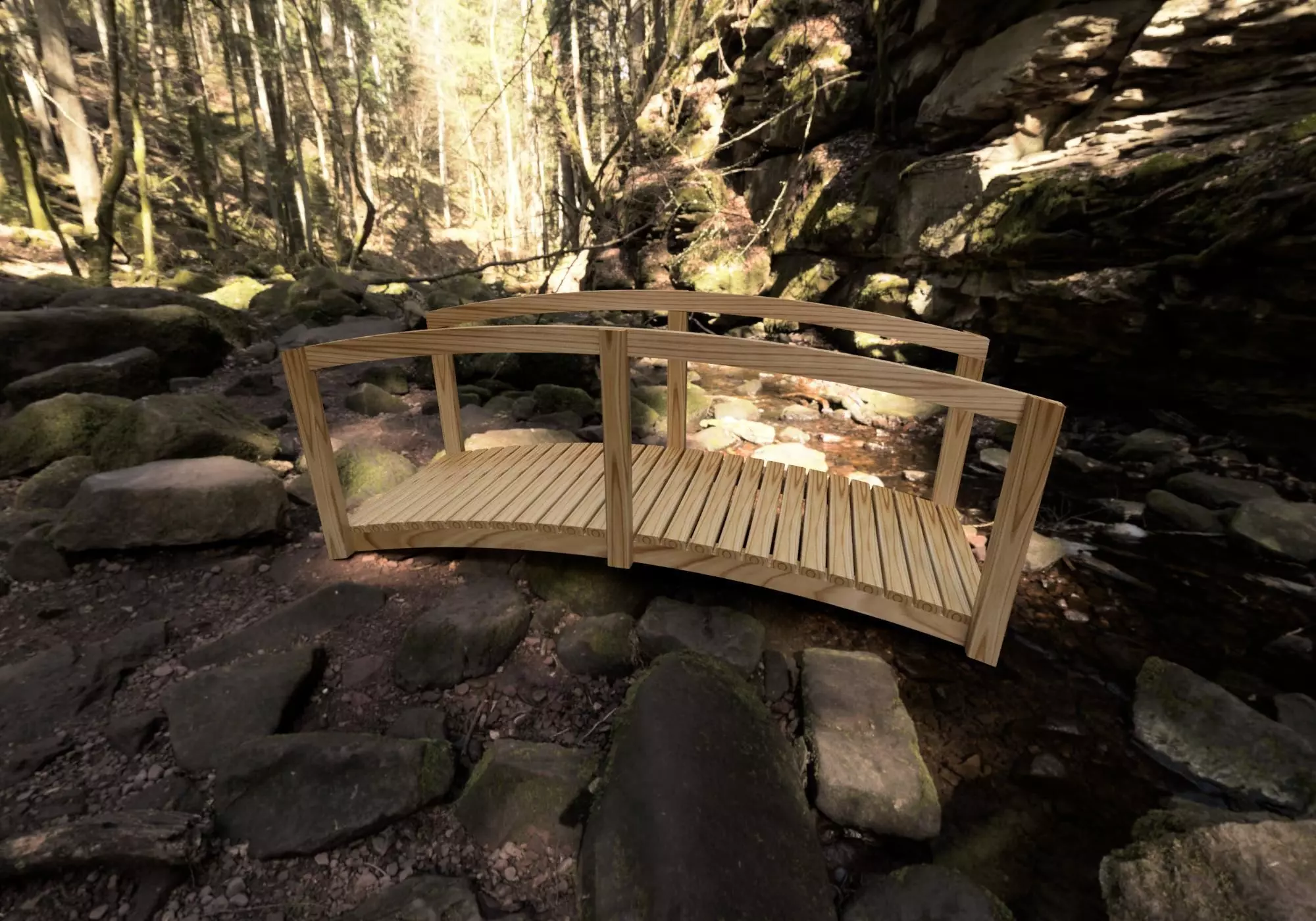 Wooden bridge for garden. The file is separate in different components. This is a wooden arc bridge. Dimension 300 cm x 112 cm x 120 cm. The path has 100 cm width. 27 wooden slabs on the bridge. Perfect to use for decoration, landscaping, garden design and outdoor project. Can be use also for Japanese garden design. Wooden texture for all the components.