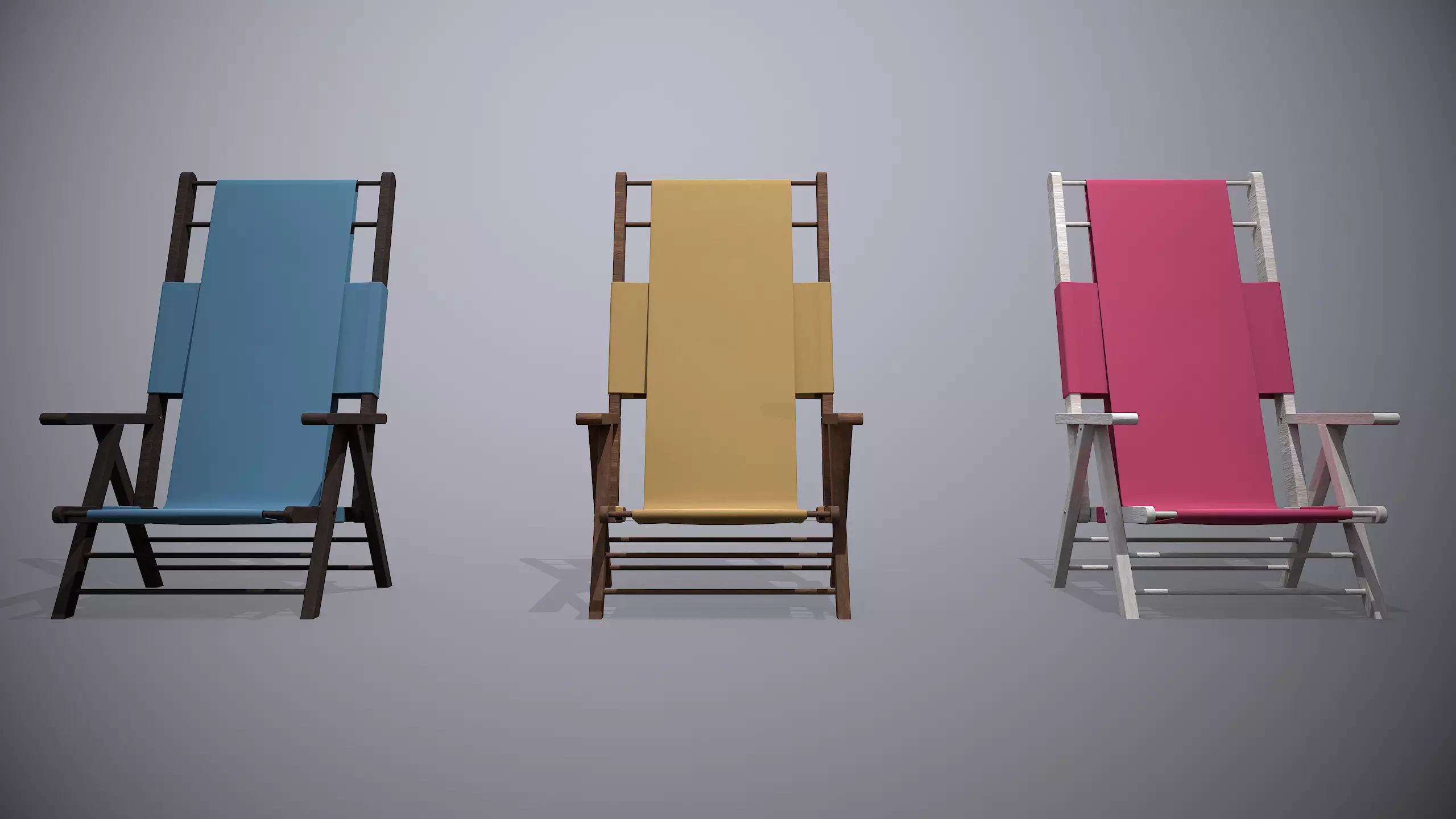 Foldable chairs. It is made of wood and fabric. It has three different wood and fabric materials. Walnut-blue fabric, oak-yellow fabric, and pine-red fabric combinations.It can be used in garden decorations, landscape designs, or near swimming pools.