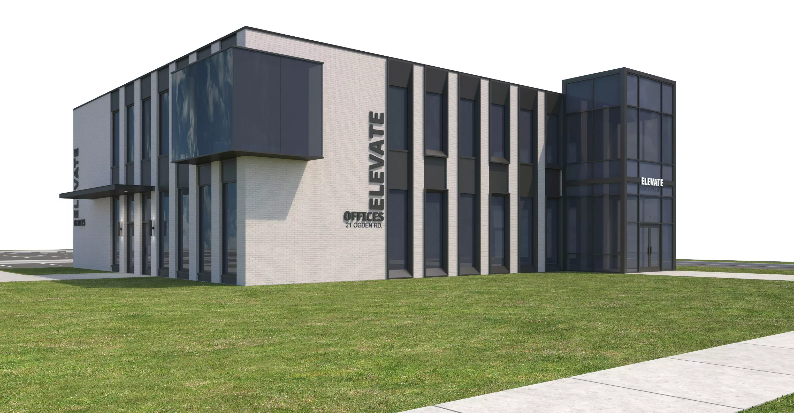 White Brick with with Modern Two story glass bump out, and Black aluminum storefront mullions and a modern structurally glazed bumped out office portion coming out of the brick. Window frames have dynamic tapered frames.Included with model are sidewalks, parking lot, everything shown in rendering.