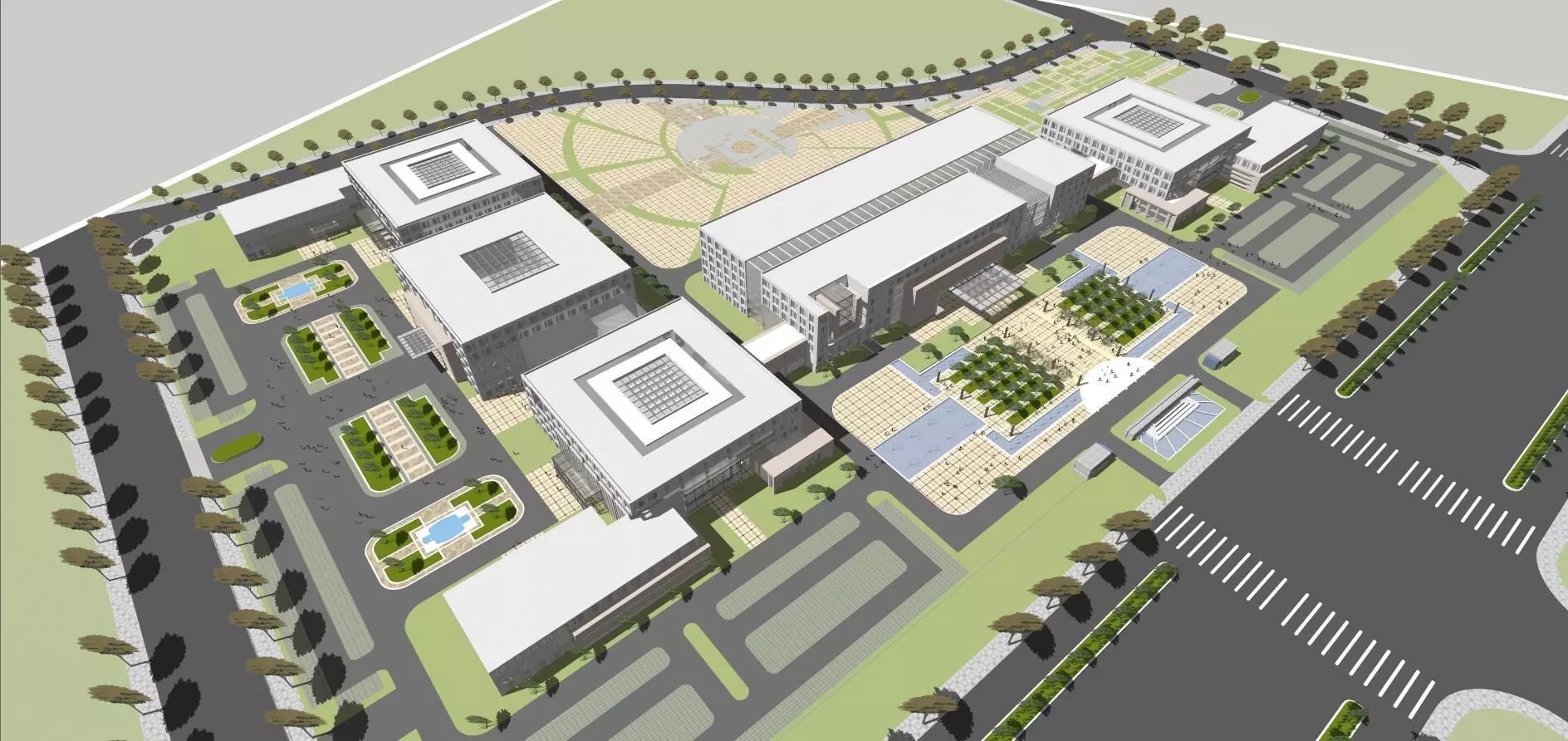 This SU model showcases the design of an open-plan headquarters office building. The surrounding area of the building has been designed with a diverse range of landscapes, including green spaces, gardens, and trees, creating a pleasant working environment. The design of the building itself emphasizes a sense of openness, providing comfortable and flexible workspaces for employees. The exterior of the building is modern and minimalist, featuring a large amount of glass curtain walls that allow natural light to enter, creating a bright and transparent indoor environment. The overall design of the building aims to enhance employees' work efficiency and satisfaction while incorporating natural elements, creating a harmonious atmosphere for work and relaxation.