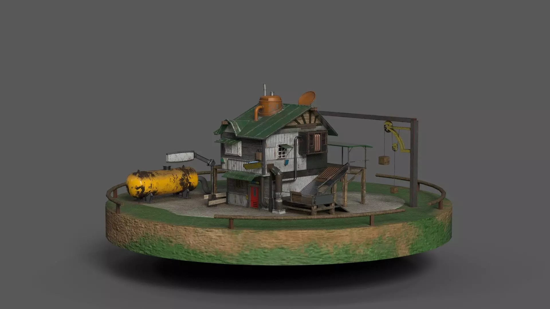 3D Diorama of Old Dockhouse with gas tank, loading and unolading crane station with unique assets like Antenna, water heater, ramp, sign board, electric boxes, wire tubes, window, A.C, chimney, etc.