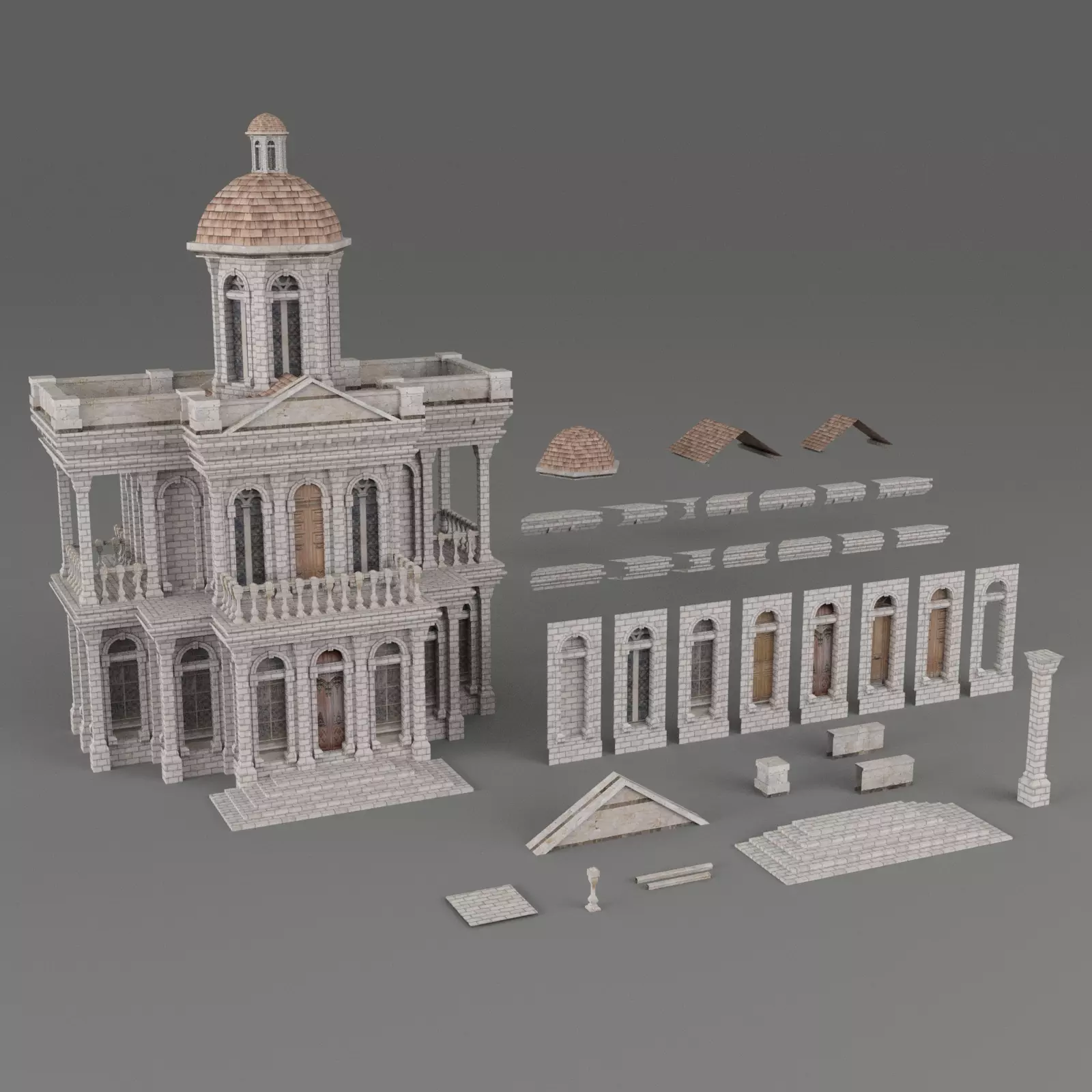 Ready town hall has about 22.717 vertices. It's entirery build with elements that are part of this set.There are 3 only three materials and 2 of them are easy to recolor in Unity or UE since they are tilable textures. The roofing and doors/windows are on separate texture.Textures are on .png format : Bricks - 1024x1024, StoneMarble 512x512, Roofing and Widows - 1024x1024