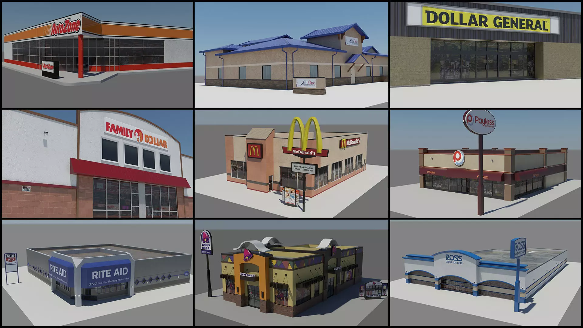 Fully textured, low-poly building models ready to drop into your scene or game. All 9 models with 2048x2048 diffuse, specular, bump/normal and self-illuminating light map included for dusk/night scenes. Maps can easily be altered to create different businesses as desired. Windows with interior texturing, additional signs, props and stone work gives a realistic look even close up. Hours and hours of work for just $69!