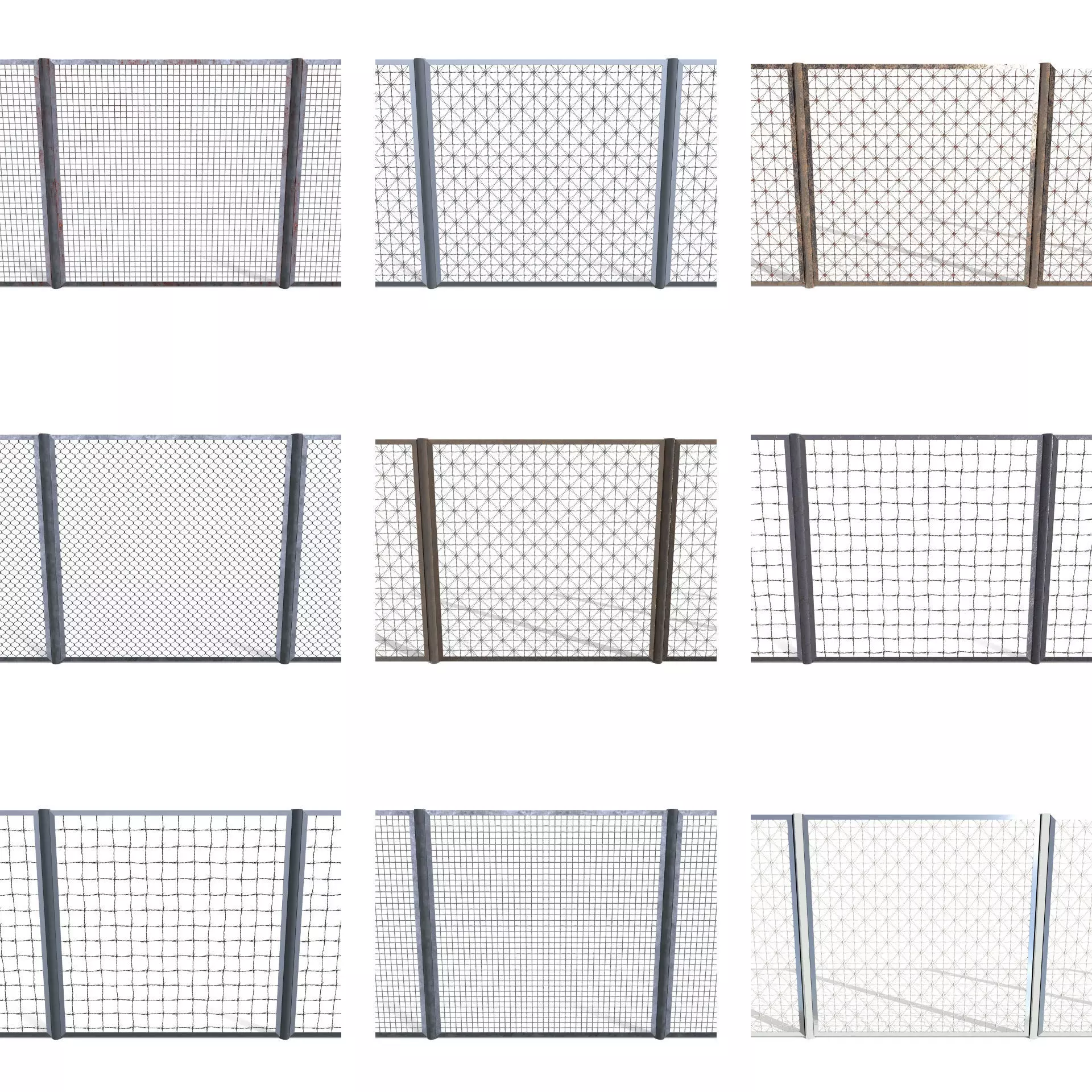 10 Fence model pack built in Blender and rendered with Cycles, with PBR materials, Game-Ready.The models come as single segments which can be arrayed very easily. The actual fence part comes as a plane with texture, thus reducing the poly count very much.