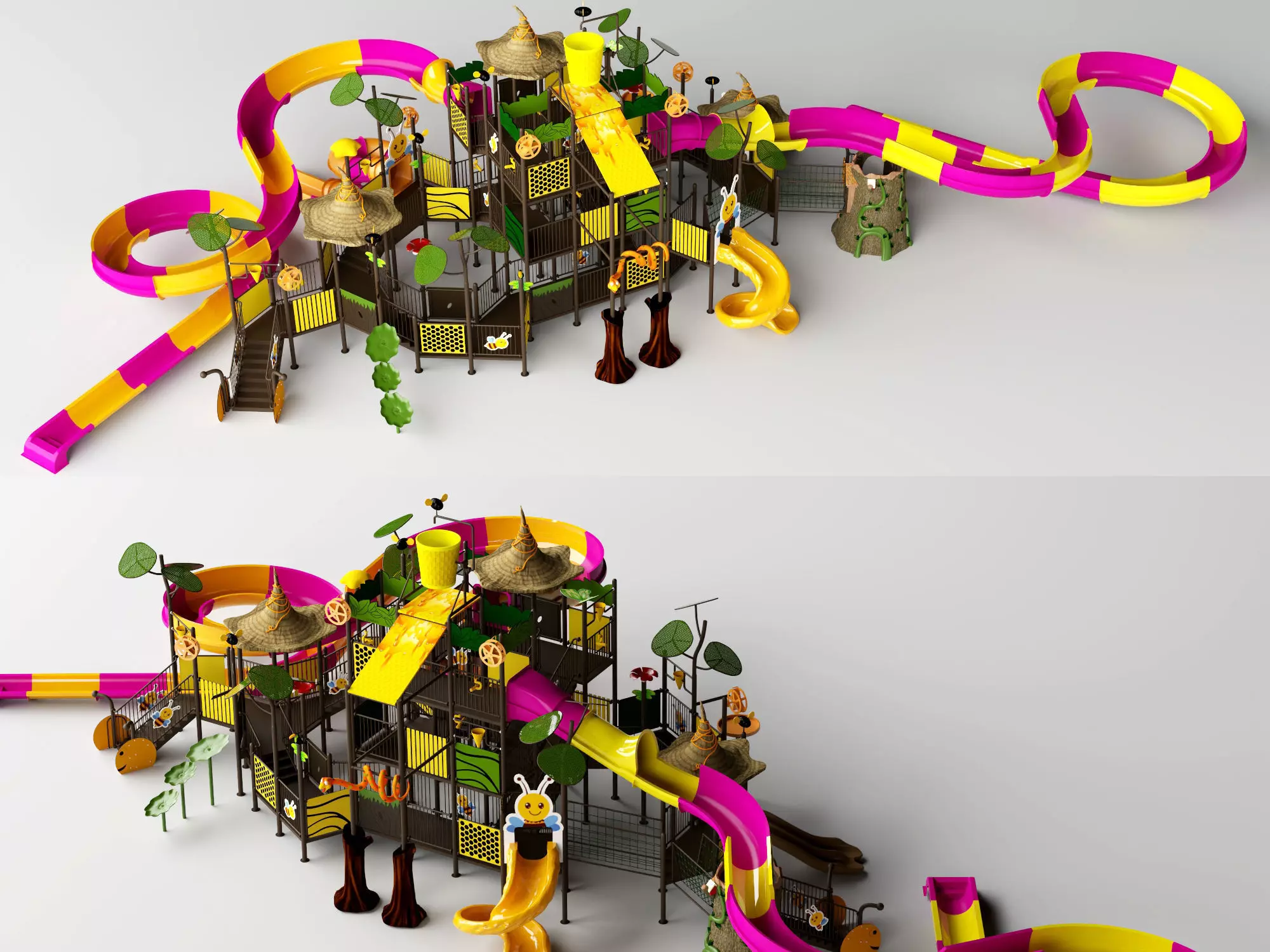 High-quality pack of large-scale adventure playground and themed children's play equipment 3D models, featuring: multi-level climbing towers, spiral/tube slides, net bridges, tunnels, swing sets, honeycomb structures, tropical leaf/plant decorations, colorful pipes/ramps, safety platforms, and detailed outdoor play props.Models built to real-world scale with high detail — vibrant plastic/metal textures, rubber grip surfaces, fabric nets, rounded safety edges, subtle weathering, and authentic themed adventure playground realism.Full PBR workflow with high-res textures (2K-4K): Albedo, Roughness, Metallic, Normal, AO maps for realistic color vibrancy, plastic shine, rubber softness, and depth in any lighting.Ideal for:• Architectural visualization and playground renders• Kindergarten, public park, theme park, and family entertainment builds• Children's adventure and safe play area scenes• Game assets (Unity/Unreal ready)• VR/AR kids play simulations and virtual parks• VFX, promotional videos, landscape designOptimized polycount for real-time — drag and drop to enhance scenes instantly.Compatible formats:MAX (with materials), OBJ, FBXCompatible with 3ds Max, Maya, Blender, Cinema 4D, Unity, Unreal Engine, and more.