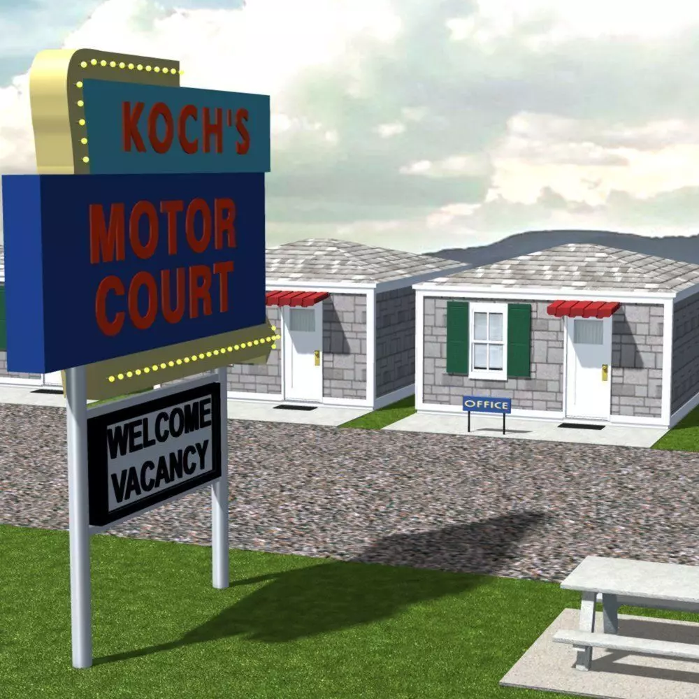This is a model of a motor court, also known as a motel. Motor courts were usually found on most major highways and had lower prices than hotels. But as interstate roads started to develop, motor courts started to decline in popularity.