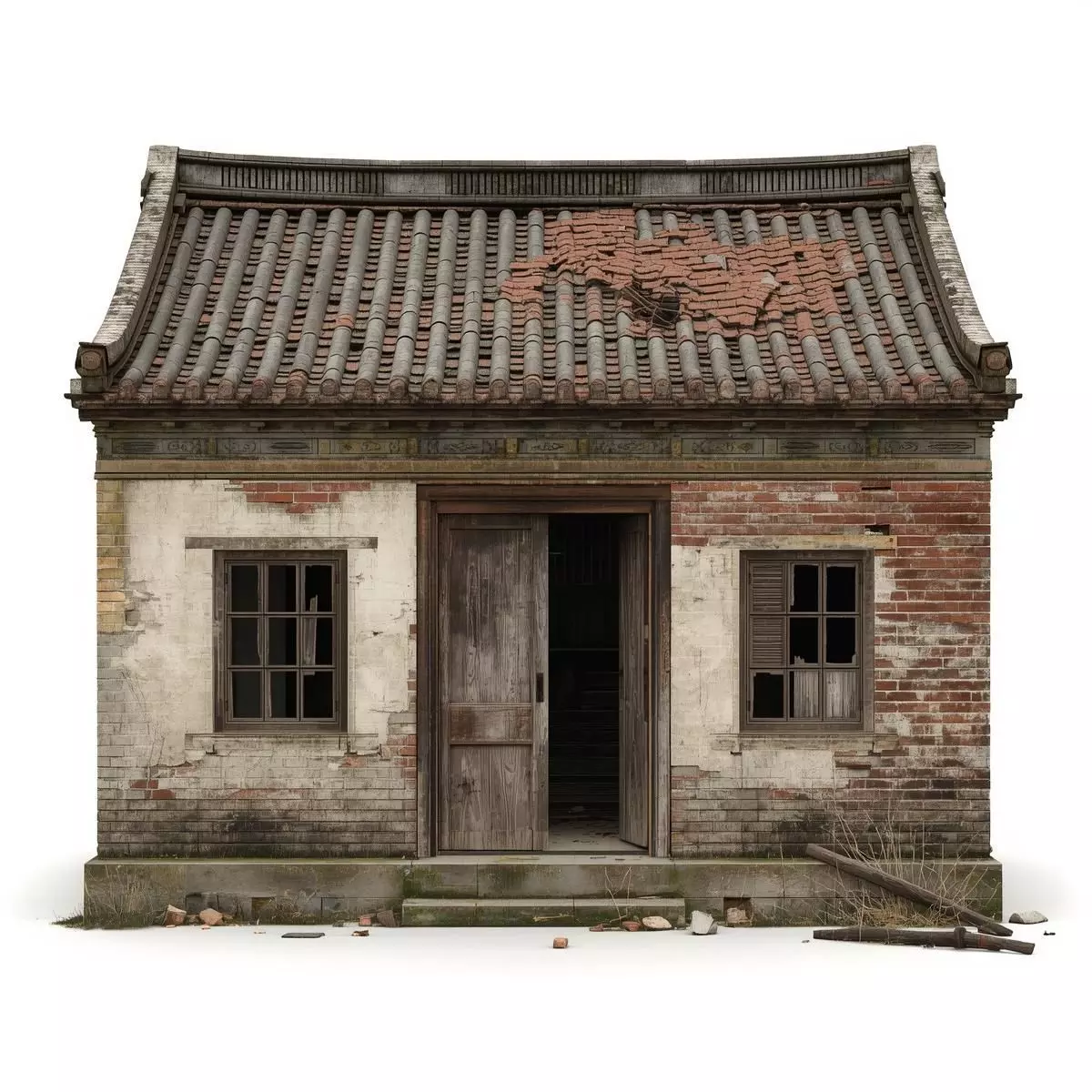 Tags3d model Chinese house ruined architecture rural building collapsed roof weathered brick ancient structure damaged tiles oriental design historical asset game ready prop isolated object pbr materials abandoned home