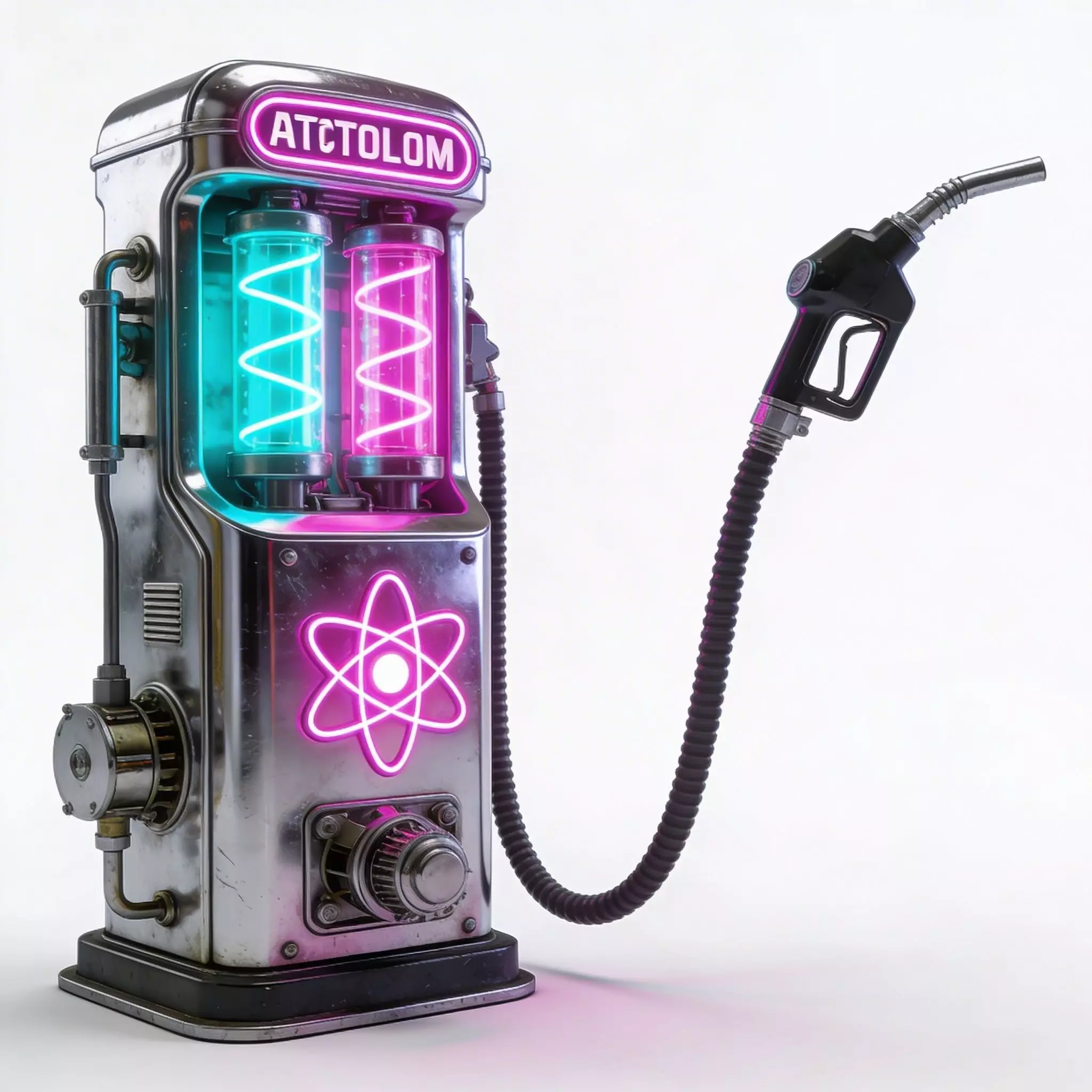 Gas pump featuring a polished chrome body with a striking Atompunk or retro-futuristic aesthetic. The unit is defined by its vibrant neon components, including two glass cylinders containing glowing cyan and magenta plasma coils. A large neon atomic symbol and an ATCTOLOM sign plate on the upper casing provide a distinct 1950s science fiction glow. It is equipped with a modern black fuel nozzle attached to a flexible ribbed hose, and features intricate industrial details such as side-mounted pipes, a rotating dial, and a heavy-duty base plate. The combination of high-gloss metallic surfaces and colorful emissive lighting makes it an ideal asset for futuristic cityscapes. This models is suitable for remesh and decimate.