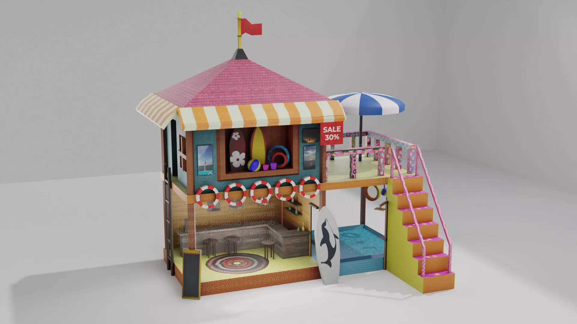 Beach shop with bar 3D Model The shop sells beach essentials and also sells drinks and food. The model can be used in store design projects and also suitable for use in game projects. And all the textures are 2048x2048 pixels.