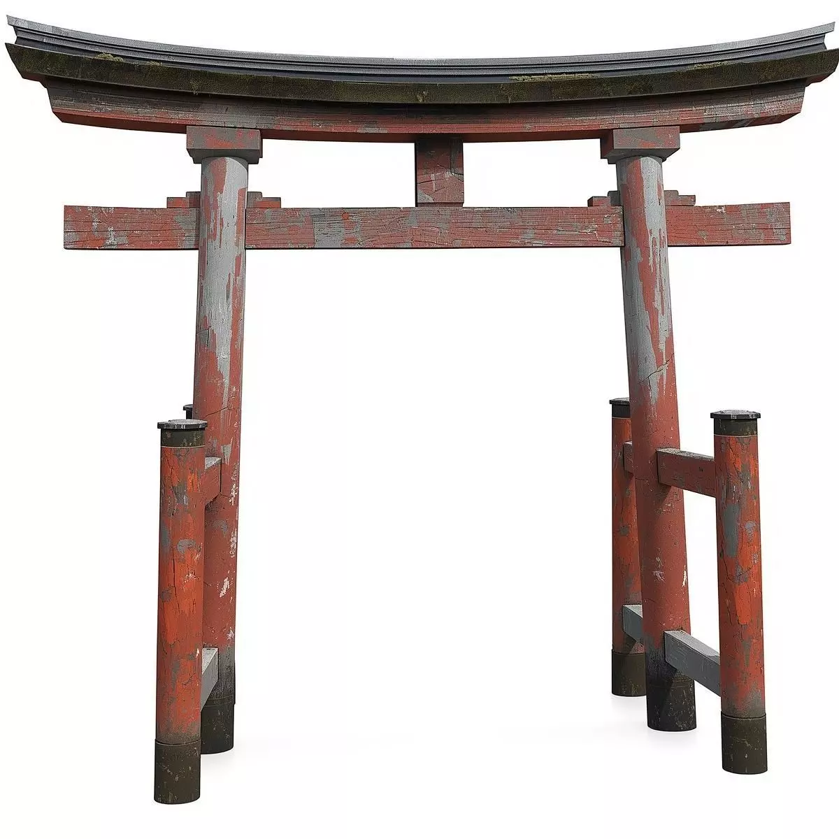 Tags3d model Japanese torii gate broken architecture ancient ruins cracked pillars chipped red paint partially fallen crossbeam aged wood surface moss patches realistic proportions historical asset game ready prop fantasy environment isolated object pbr materials
