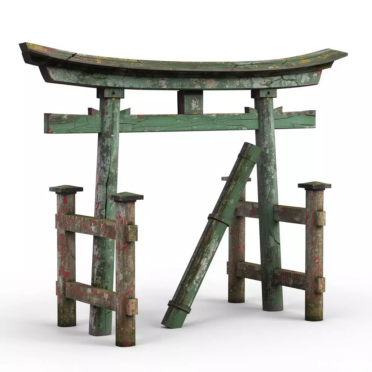 Tags3d model Japanese torii gate broken architecture ancient ruins cracked pillars chipped red paint partially fallen crossbeam aged wood surface moss patches realistic proportions historical asset game ready prop fantasy environment isolated object pbr materials