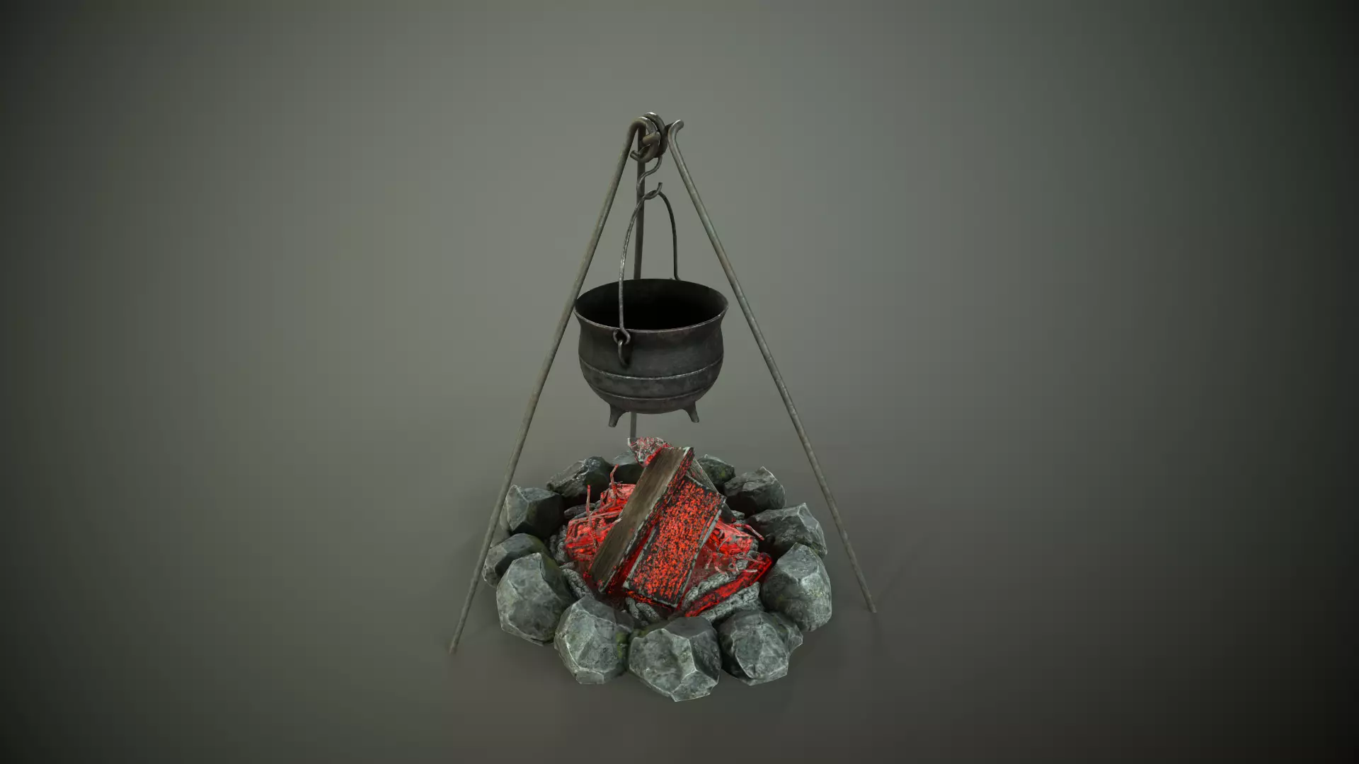 Game Ready Low Poly campfire with cauldron. Consist of 2 assets with textures. All meshes have two UV channels one for textures and second for light baking. Tested on Unreal Engine 4.24. DX and Open GL normal maps included.