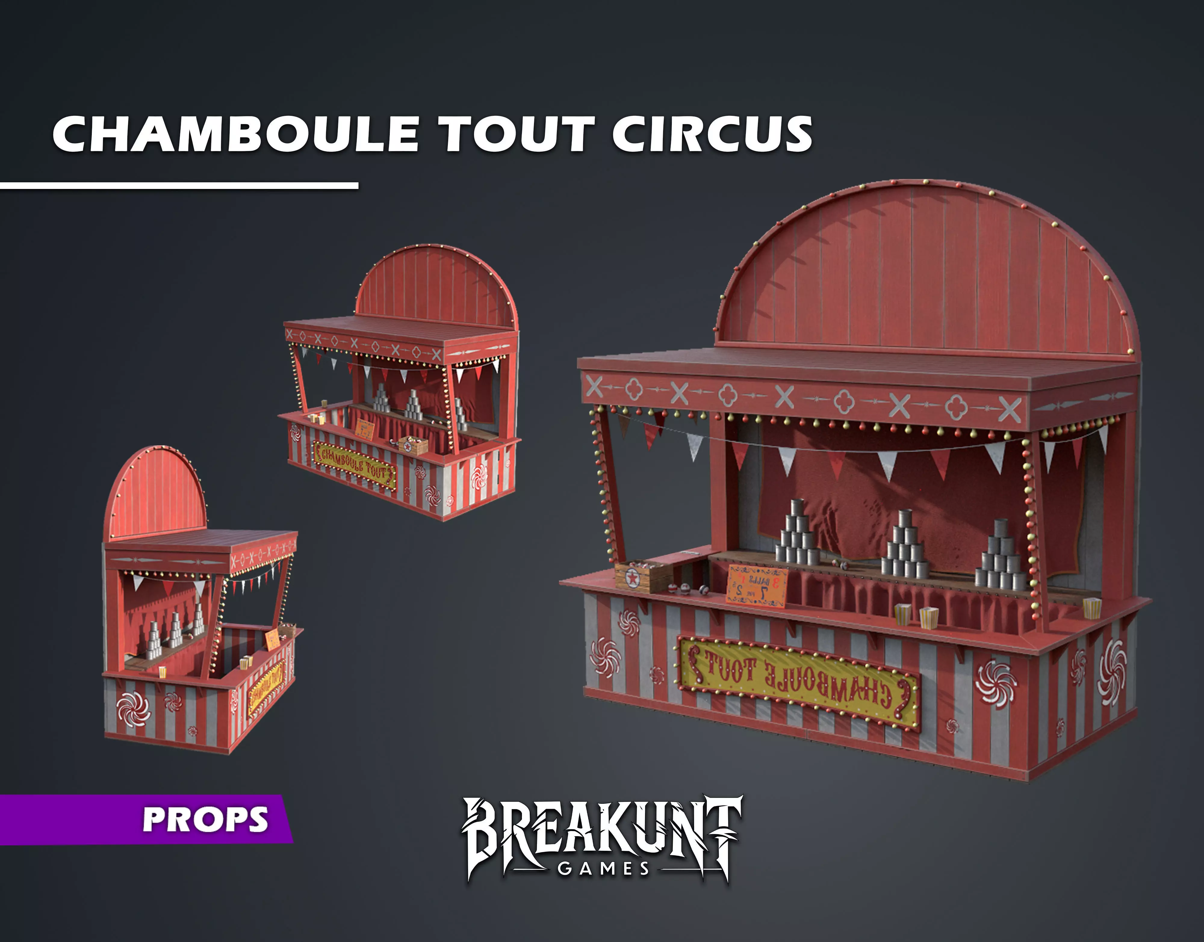 Tags :circus, carnival, festival, midway, funfair, fairground, chamboule tout, throwing game, carnivalbooth, circus booth, carnival stand, festival stand, knock down game, carnival props, vintage circus,retro carnival, wooden stand, red and white booth, game stand, carnival attraction, realistic carnival,horror circus, festival prop, 3d booth, tin cans, throw balls, pyramid cans, shooting game, fair booth,funfair attraction, game asset, low poly circus, optimized game prop