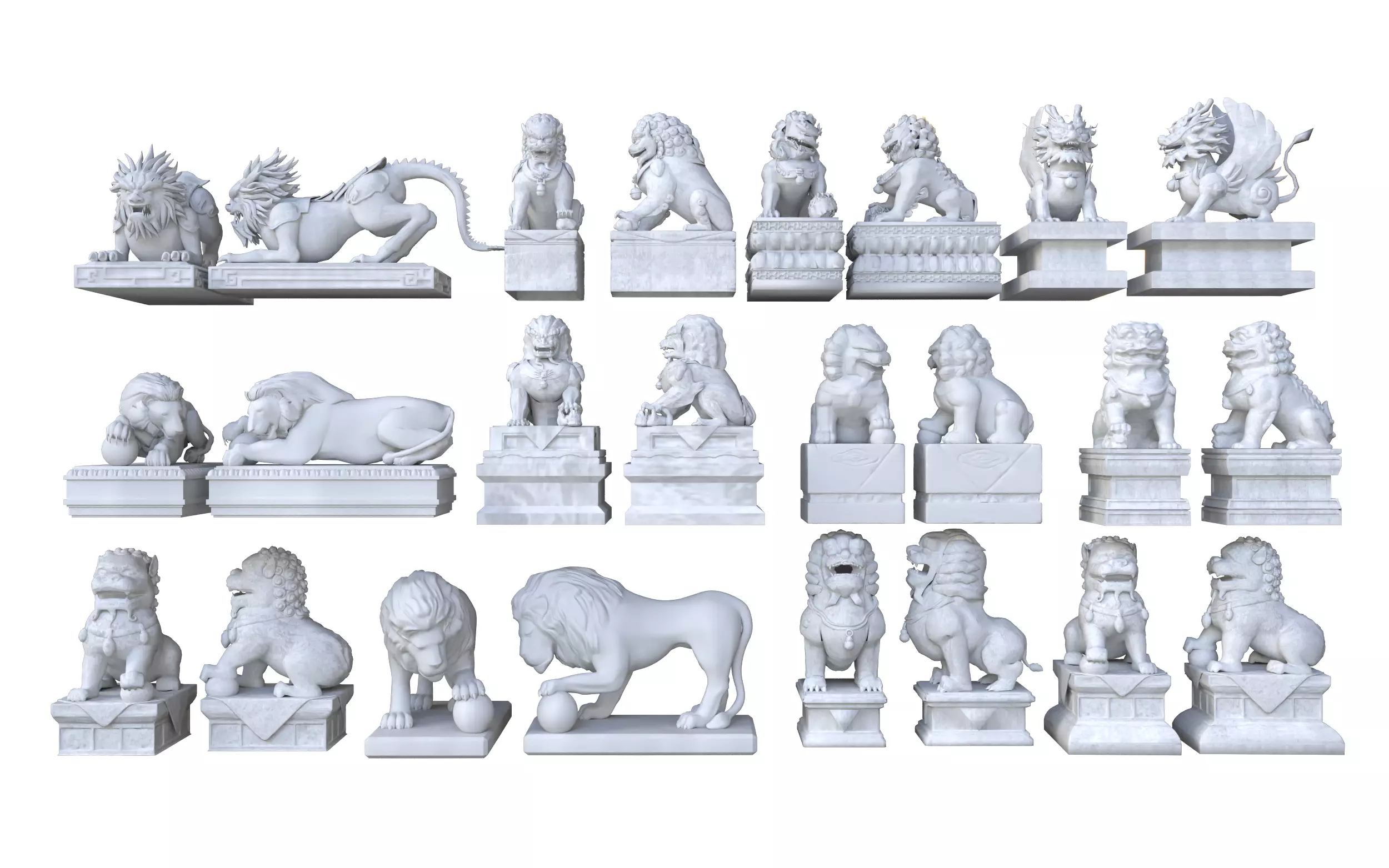 Professional Chinese Guardian Lion & Mythical Beast Mega CollectionElevate your oriental or classical architectural projects with this comprehensive set of 24 high-quality Chinese guardian statues. This mega-pack includes traditional Foo Dogs (Shi Shi), mythical Pi Xiu, and various imperial lion poses, all meticulously detailed for professional rendering.Technical Specifications:Software: Native 3ds Max files (compatible with 2018 versions and above).Renderer: V-Ray materials and high-end lighting setup included. Ready to render!Export Formats:.MAX (Source file with V-Ray Shaders).FBX (Cross-platform compatibility).OBJ (Standard geometry format)Geometry: High-quality polygonal mesh optimized for architectural visualization and close-up detail.Textures: Includes realistic white marble/stone PBR materials.Scale: Accurate real-world metric scale.Ideal For: Chinese garden design, temple visualizations, luxury oriental villas, historical environments, and game level design.