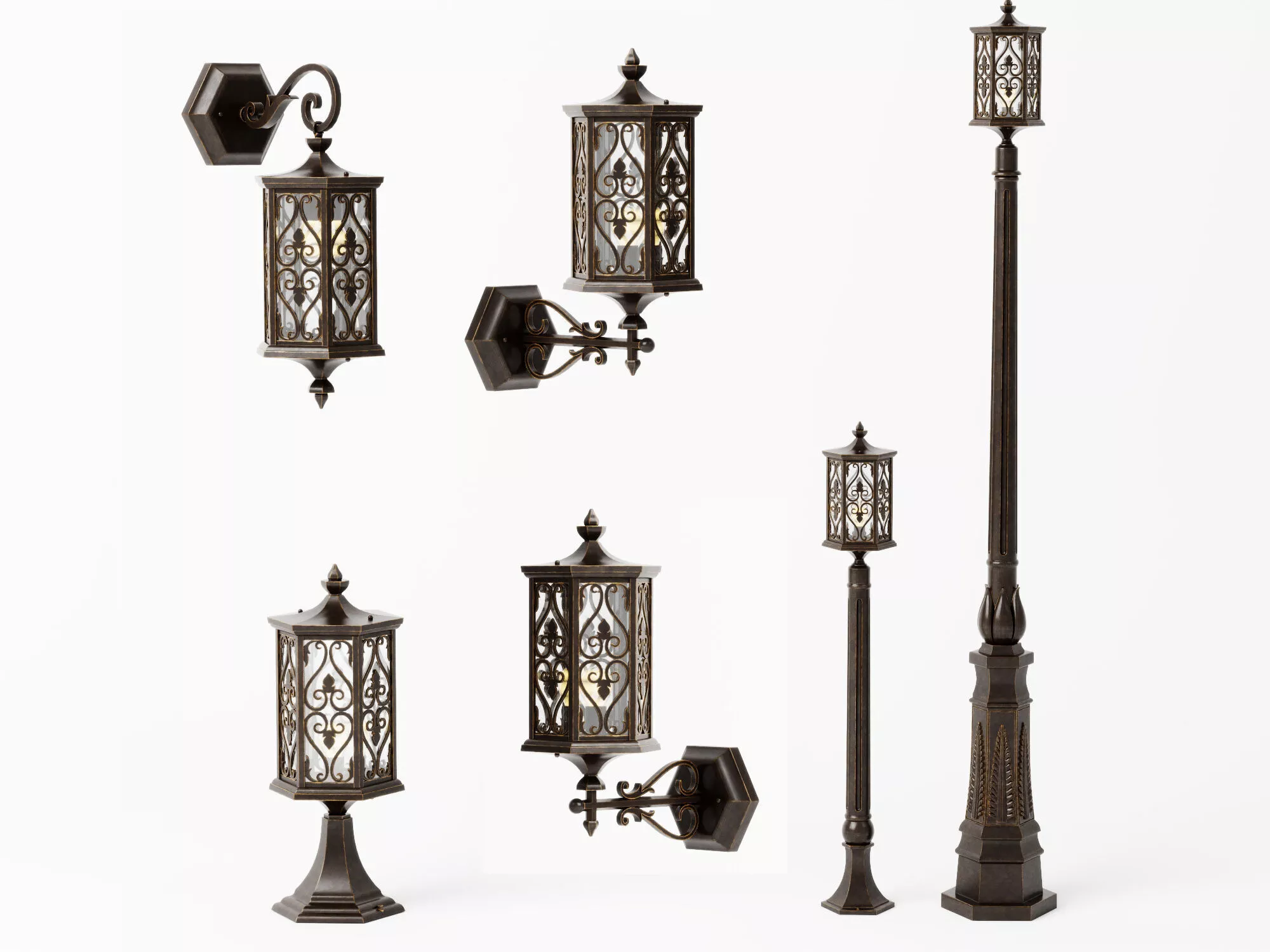 Professional high-quality 3D collection of Classic European Exterior Lighting meticulously crafted for high-end architectural visualization historic district planning and luxury landscaping projects. This comprehensive asset pack features a complete series of matching fixtures including ornate Victorian-style hanging wall lanterns upright porch lights low-profile garden pillar lamps and elegant high-post street lamps with realistic distressed bronze PBR materials and intricate decorative iron scrollwork.