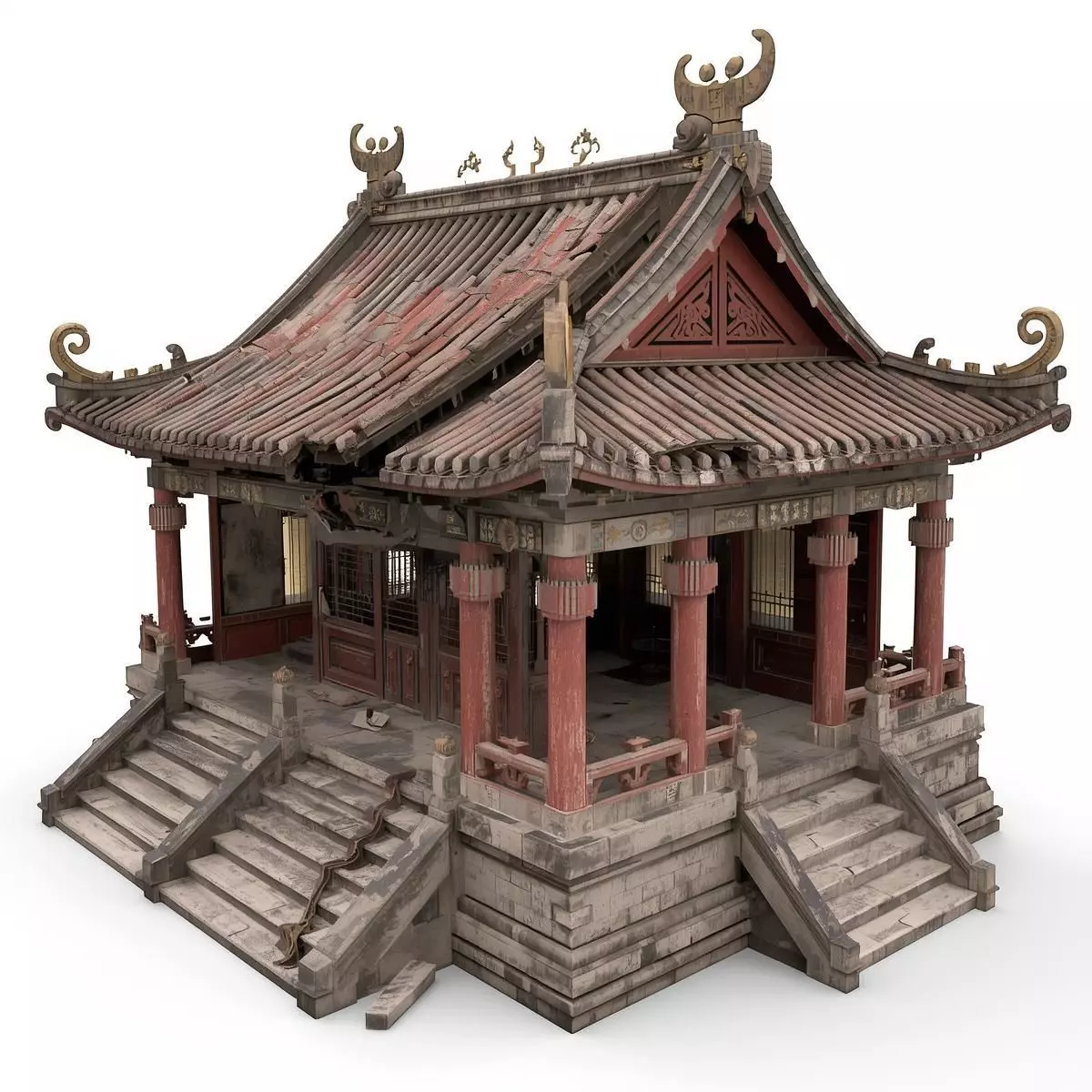Tags3d model Chinese temple damaged architecture ancient ruins cracked stone weathered columns collapsed roof traditional tiles oriental design game ready prop fantasy environment isolated building pbr materials historical diorama weathered red wood