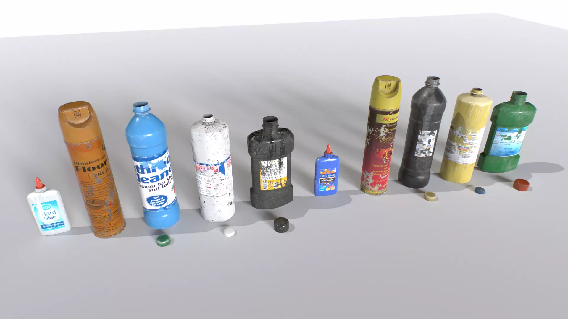 Pack of junk of plastic bottles and sprays. Realistic scale. Includes cleaners, glue bottles and sprays . 8 meshes.