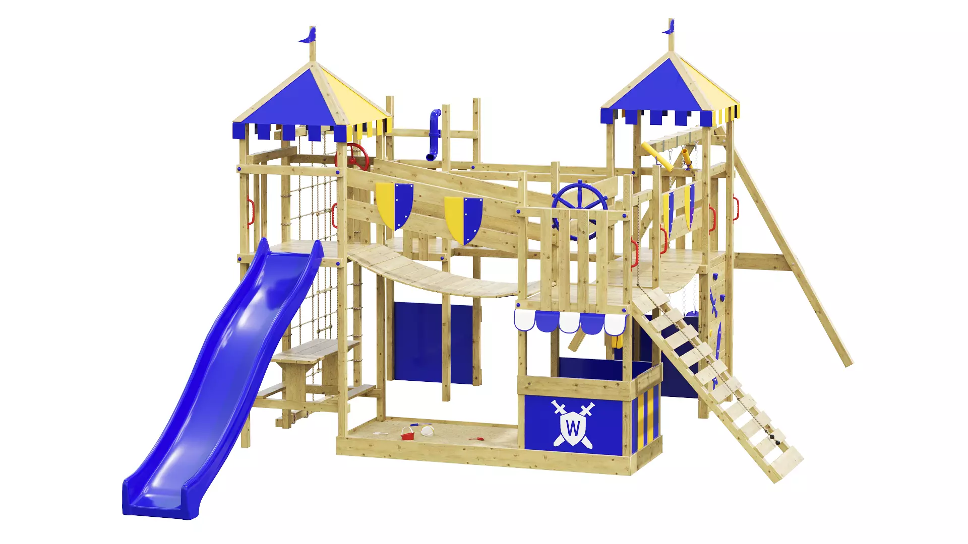 About Wickey Smart KingOur majestic Smart King children's climbing frame is the ideal addition to your garden to encourage creative play. It combines versatile play elements that provide unforgettable childhood memories linked to the world of princesses, castles, and knights. Your children can sit together with their friends at the integrated picnic table or let off steam on the climbing extension. The Smart King has several platforms and towers as well as a balance beam that connects them. Here, little adventurers can develop their balance. The large sandpit is perfect for digging and building, while the authentic suspension bridge opens the door to endless fantasy worlds for your children.