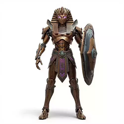 Techno-Pharaoh Fusion: The model is a humanoid robot that blends ancient Egyptian royalty with advanced cybernetics.