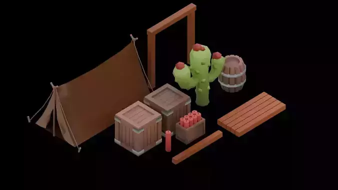 Mine carts and railsCrystals, ores, and resource variationsWooden crates and barrelsMining tools (pickaxe, shovel, hammer)Lanterns and propsTent and camp elementsEnvironmental props (cactus, rocks, resources)
