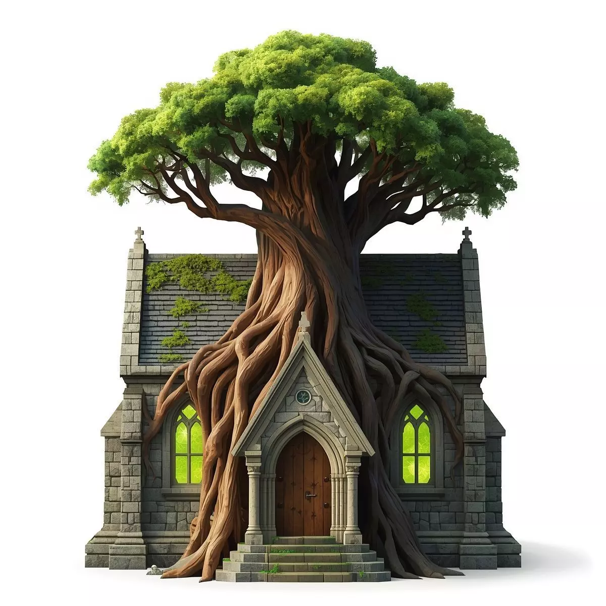 The Overall Concept This structure represents the perfect union of nature and civilization. It is a stone chapel or shrine that has been reclaimed by the forest, or perhaps built specifically by Druids to honor the Mother Tree. It fits perfectly in an enchanted forest, an elven city, or a sacred grove.