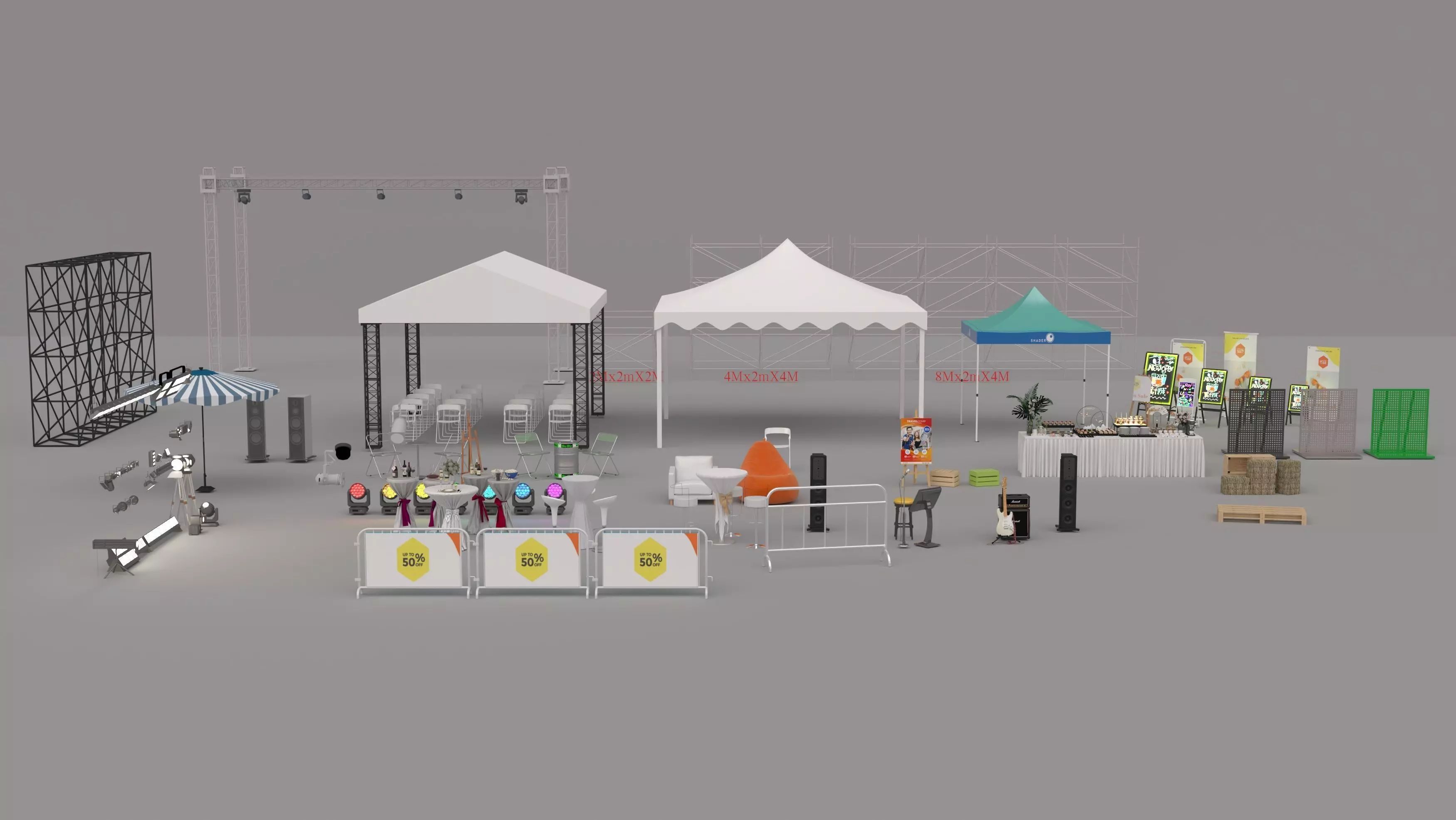 Speaker systems and audio equipmentCrowd barriers & safety fencesEvent furniture (chairs, tables, sofas, bean bags)Food & drink boothsSignboards, stands, and promotional elementsDecorative props for outdoor events
