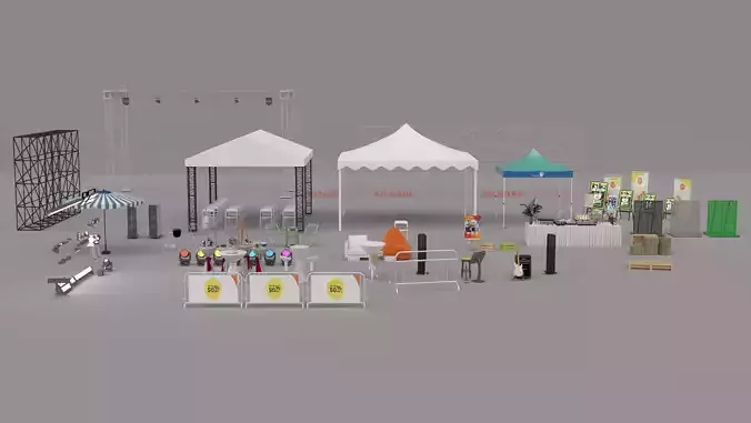 Complete event equipment collection 3D model designed for festivals, outdoor events, exhibitions, brand activations, and corporate functions.This pack includes a wide range of modular event assets, allowing users to quickly build realistic event layouts and professional presentations.The collection features event tents, truss structures, lighting systems, speakers, stage barriers, furniture, food booths, signage, and decorative props, suitable for both small and large-scale event visualizations.