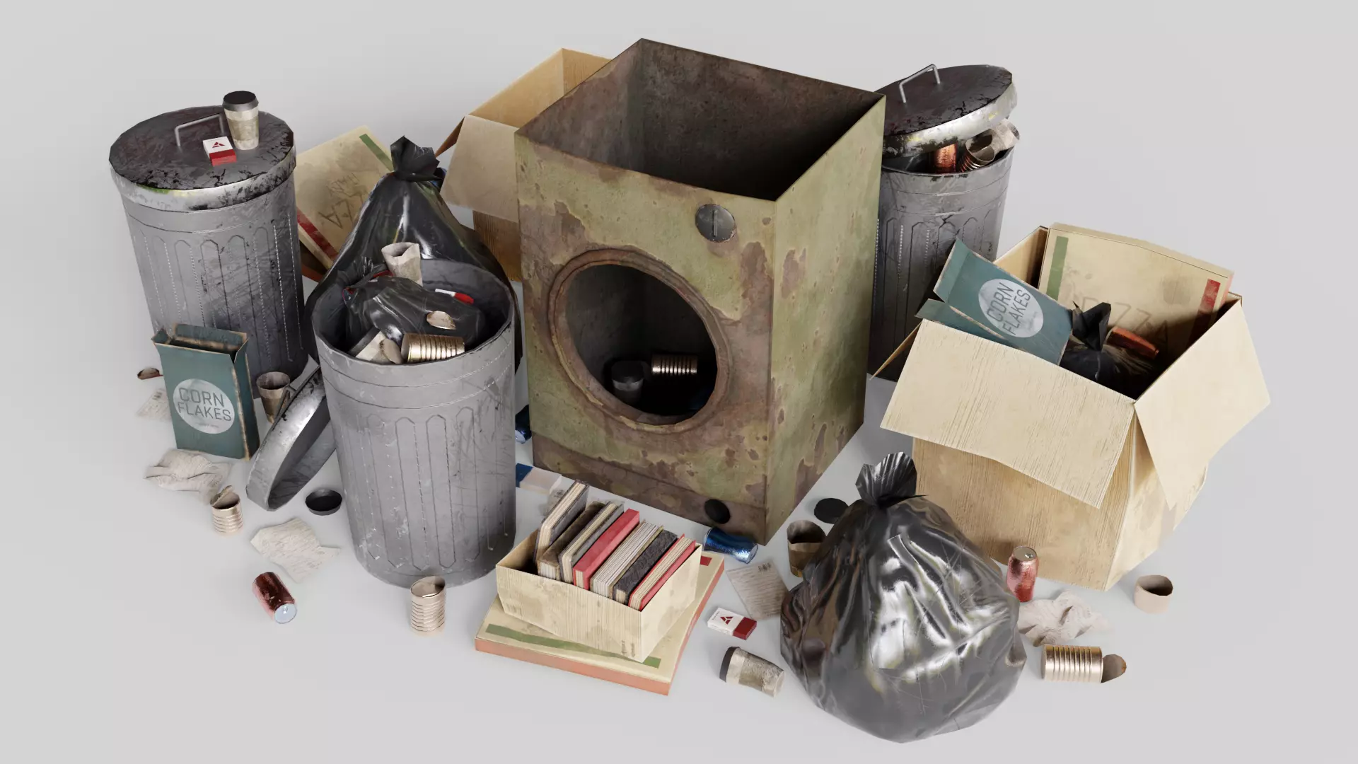 Pack contain 46 different objects (Cardboard Boxes, Garbage bags, Trash bin, Washing machine, Books, Crumpled papers)