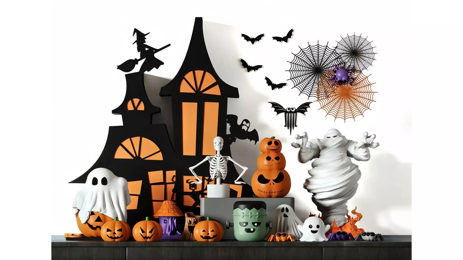 This is a creative set of Halloween-themed decorations, dominated by black, white, and orange tones, creating a festive atmosphere that is both spooky and cute. In the scene, black silhouettes of a haunted house and a witch on a broomstick serve as the backdrop, paired with bat stickers and spider web decorations on the wall to set a mysterious tone. In the foreground, there are playful props such as stacked jack-o'-lanterns, white ghost figurines, a skeleton model, and a Frankenstein-shaped storage jar. The pumpkins of varying sizes feature different expressions, while the ghosts appear to be either sitting or floating, with spiders and flame elements adding accents throughout. The overall arrangement is rich in layers, making it ideal for Halloween parties, home displays, or themed photography, seamlessly blending traditional Halloween elements with modern design sensibilities.