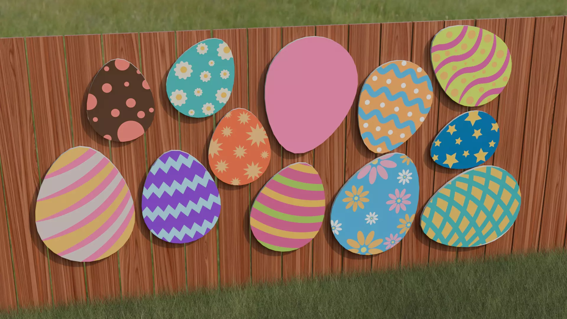 Brighten your spring scenes with this Hanging Easter Egg Fence Art set—a cheerful collection of twelve painted plywood eggs designed to hang along a fence, porch, or garden backdrop. The set includes three sizes of eggs—24, 20, and 16"—with four of each size. Each piece is shaped as a smooth cutout and finished with festive painted patterns, making the set perfect for Easter décor, seasonal displays, or vibrant outdoor render environments.