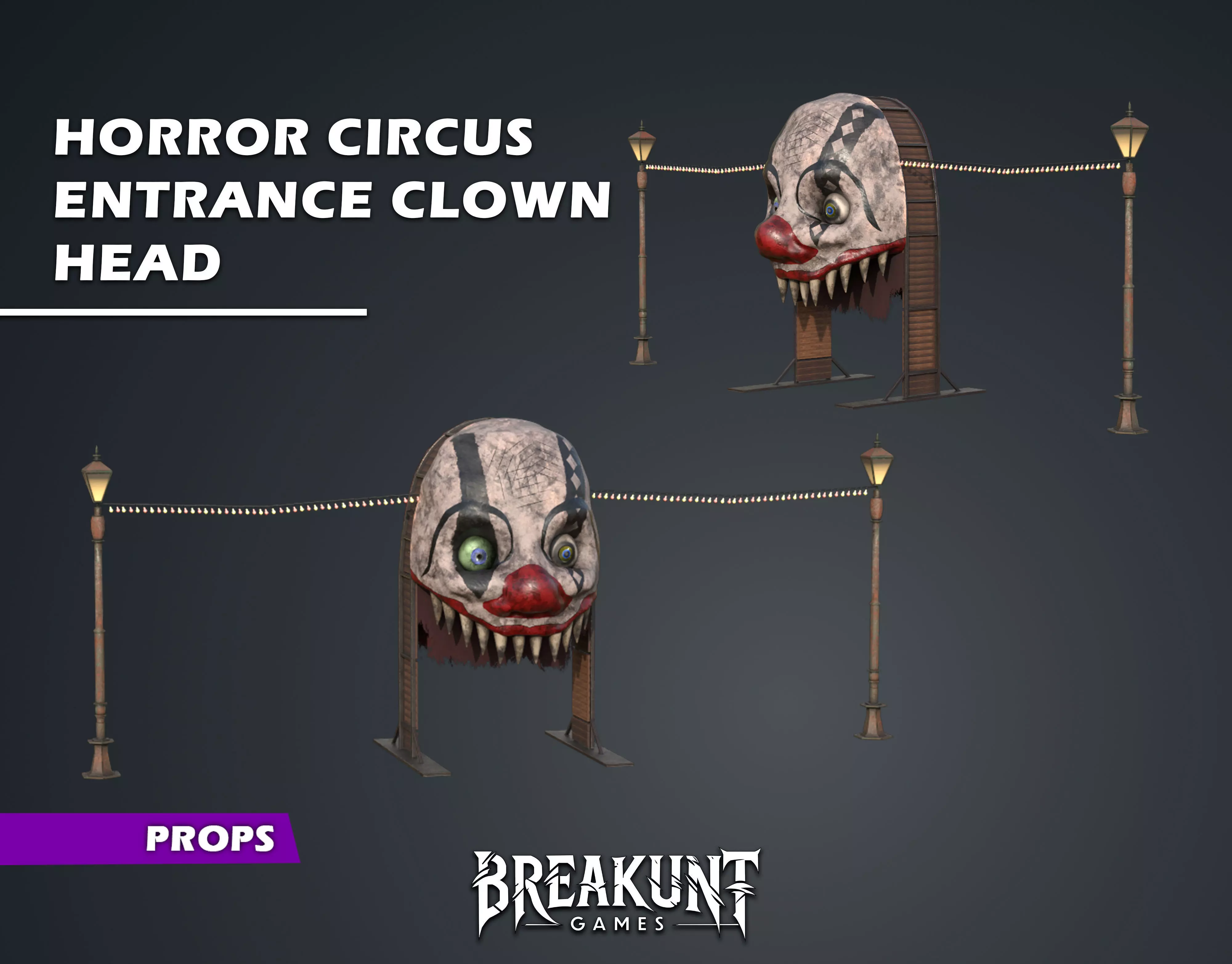 Horror Circus Entrance Clown Head is a game-ready 3D prop designed for realistic horror environments. This high-quality model includes a giant creepy clown head, old rusty lampposts, and hanging carnival lights, making it ideal for haunted circus levels, horror games, or Halloween environments.