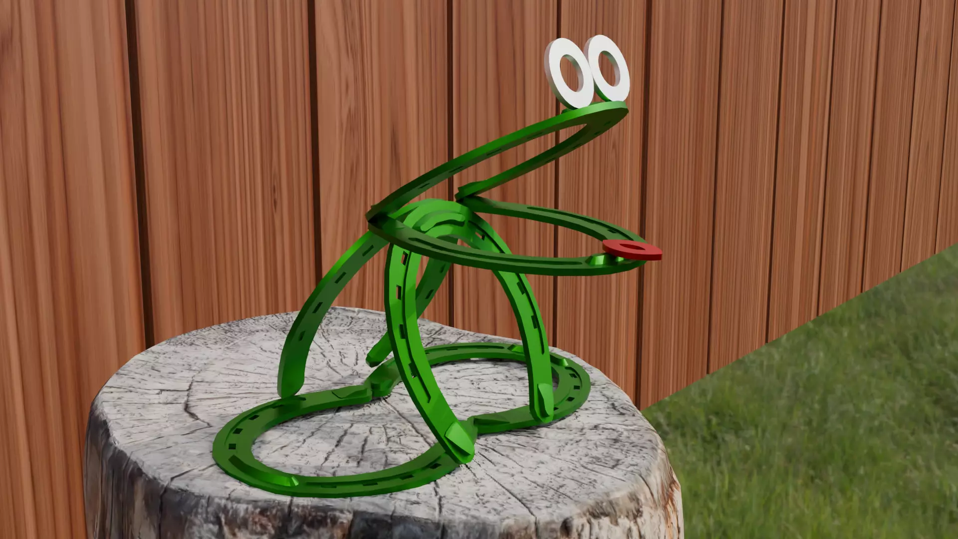 This Horseshoe Frog Yard Art sculpture is built from six full-size horseshoes arranged to form a big, friendly frog with plenty of character. Two horseshoes shape the back and body, while the others create the wide splayed legs and feet that give the frog its playful stance. Three metal washers add the finishing touches—two set high for the frog’s bright white eyes, and the third positioned as a long red tongue playfully sticking out. The frog is painted a lively green that contrasts nicely with the crisp white eyes and bold red tongue. It’s a fun, cheerful piece with a handmade rustic feel, perfect for adding personality to a garden, flower bed, porch, or any outdoor space.