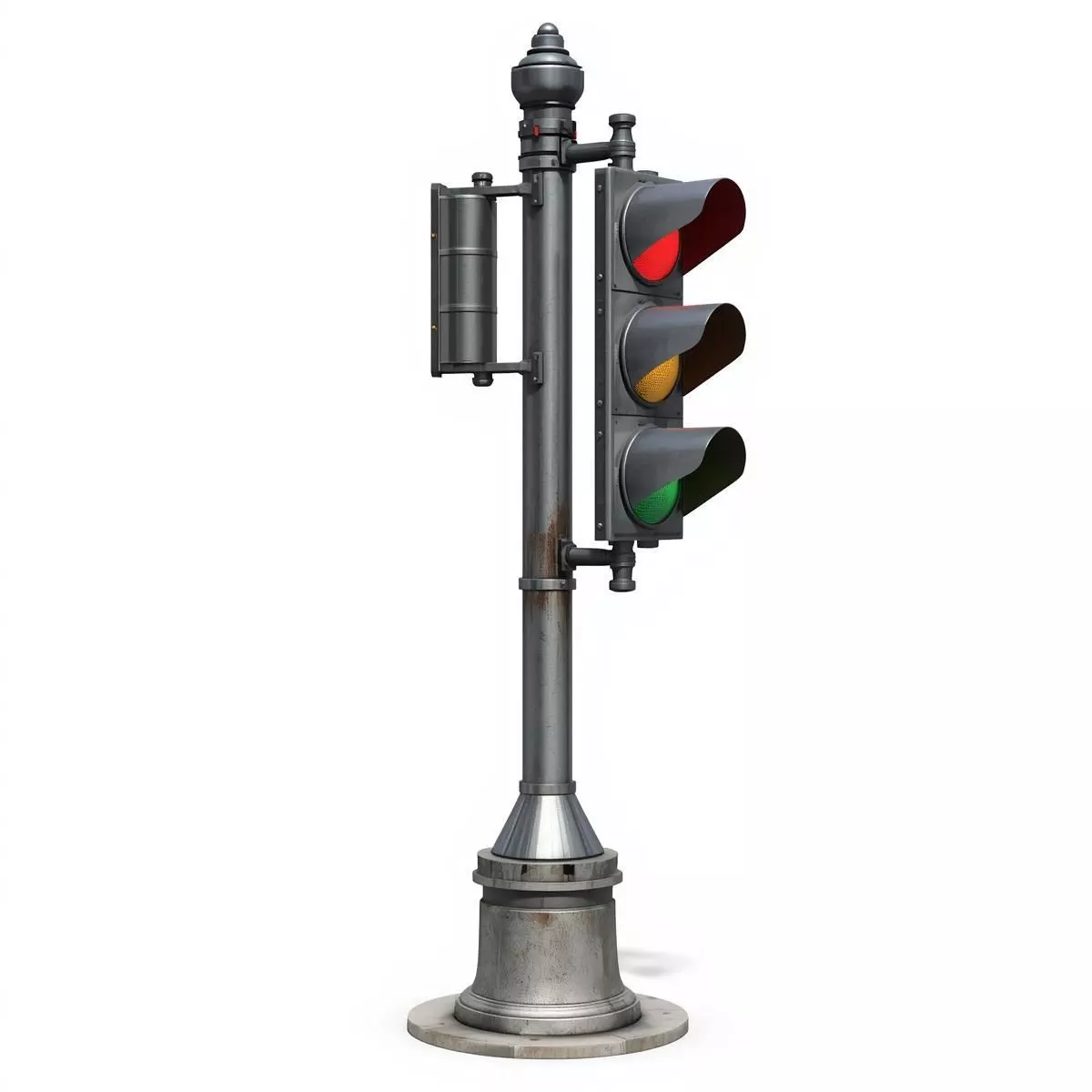 This professional 3D asset features a complete urban traffic light system designed for realistic city infrastructure and exterior environments. The model is authored with a high-fidelity PBR (Physically Based Rendering) workflow, meticulously capturing a weathered metallic finish with realistic surface scuffs and localized oxidation near the base and joints.
