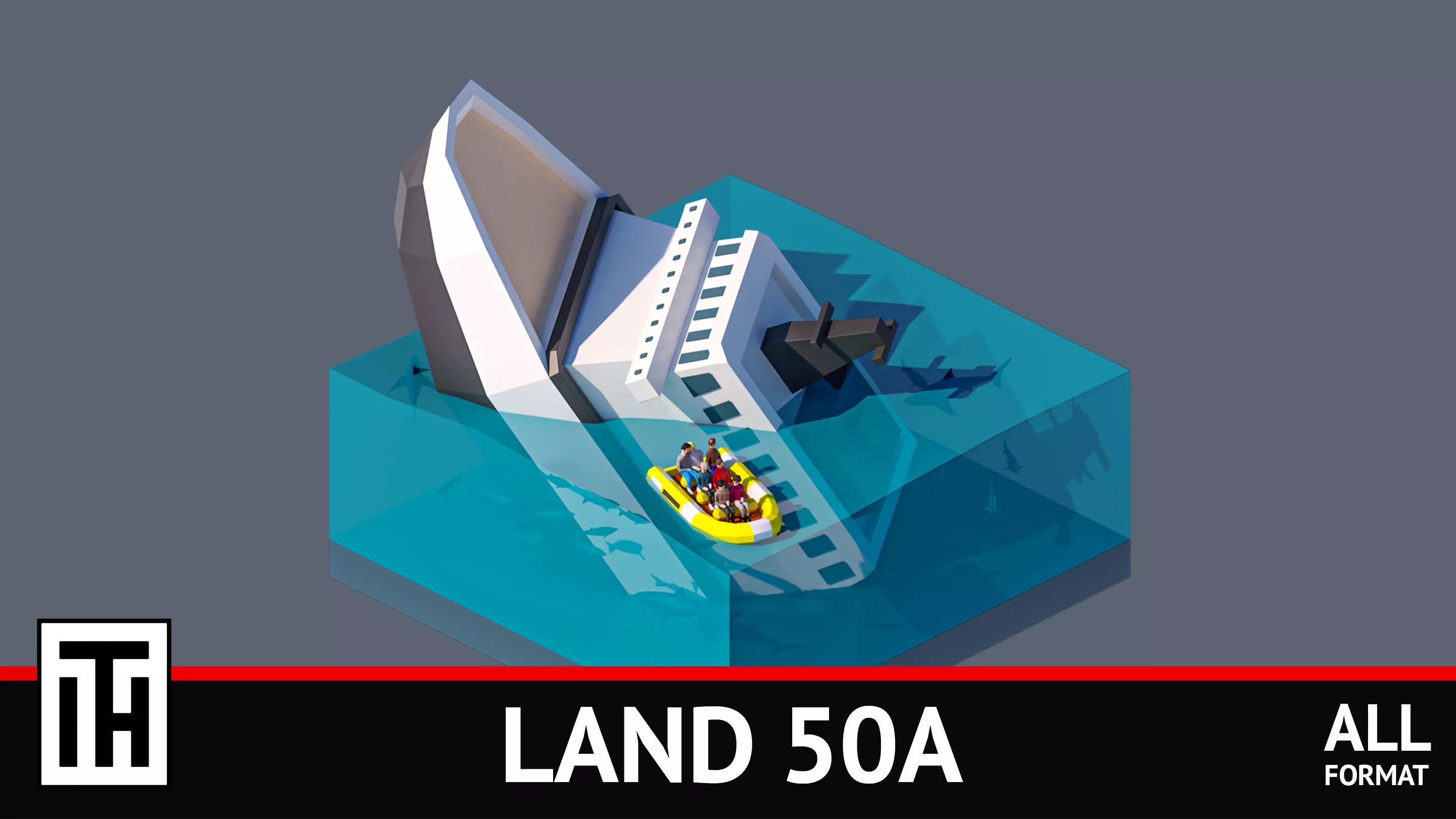 • landscape, sea, fish, sharks, shipwreck, rescue boat, human survivors.