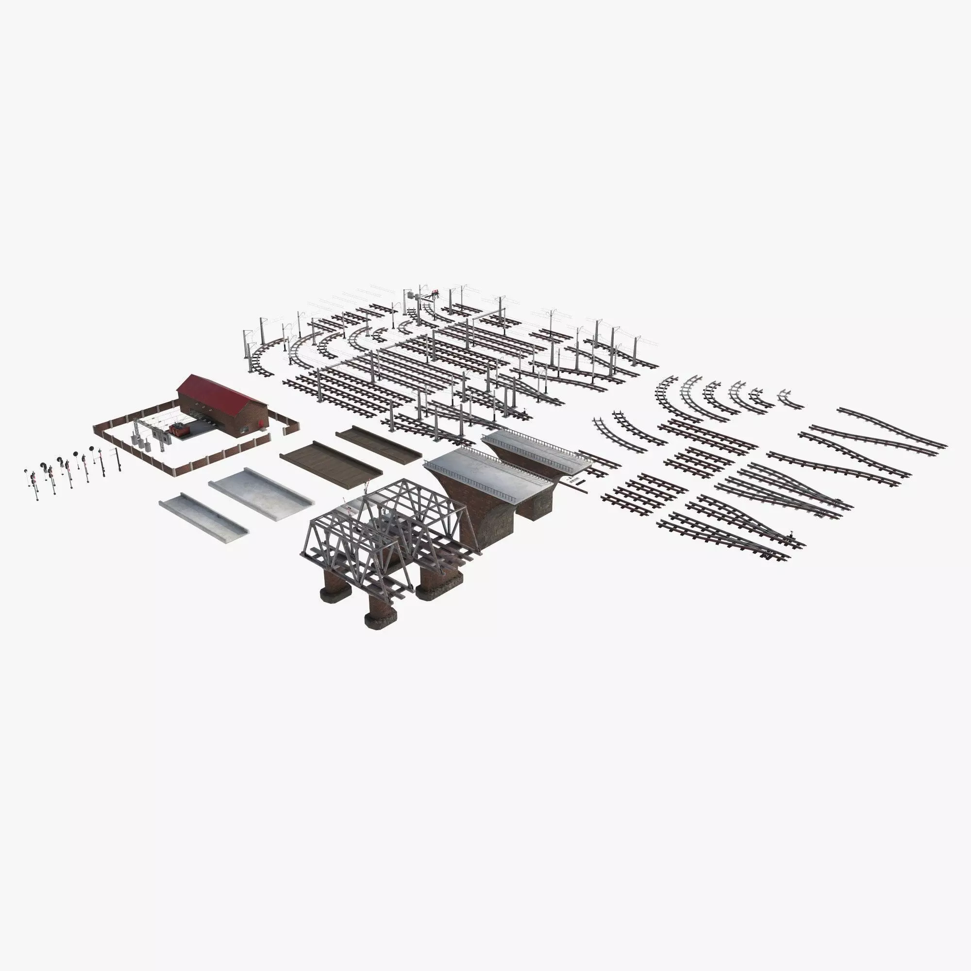 The set includes:an electrical substation,rails with wooden and concrete sleepers in three color variations — old, new, and moderately worn (straight, 45- and 90-degree turns of several types, curved, and a branch),