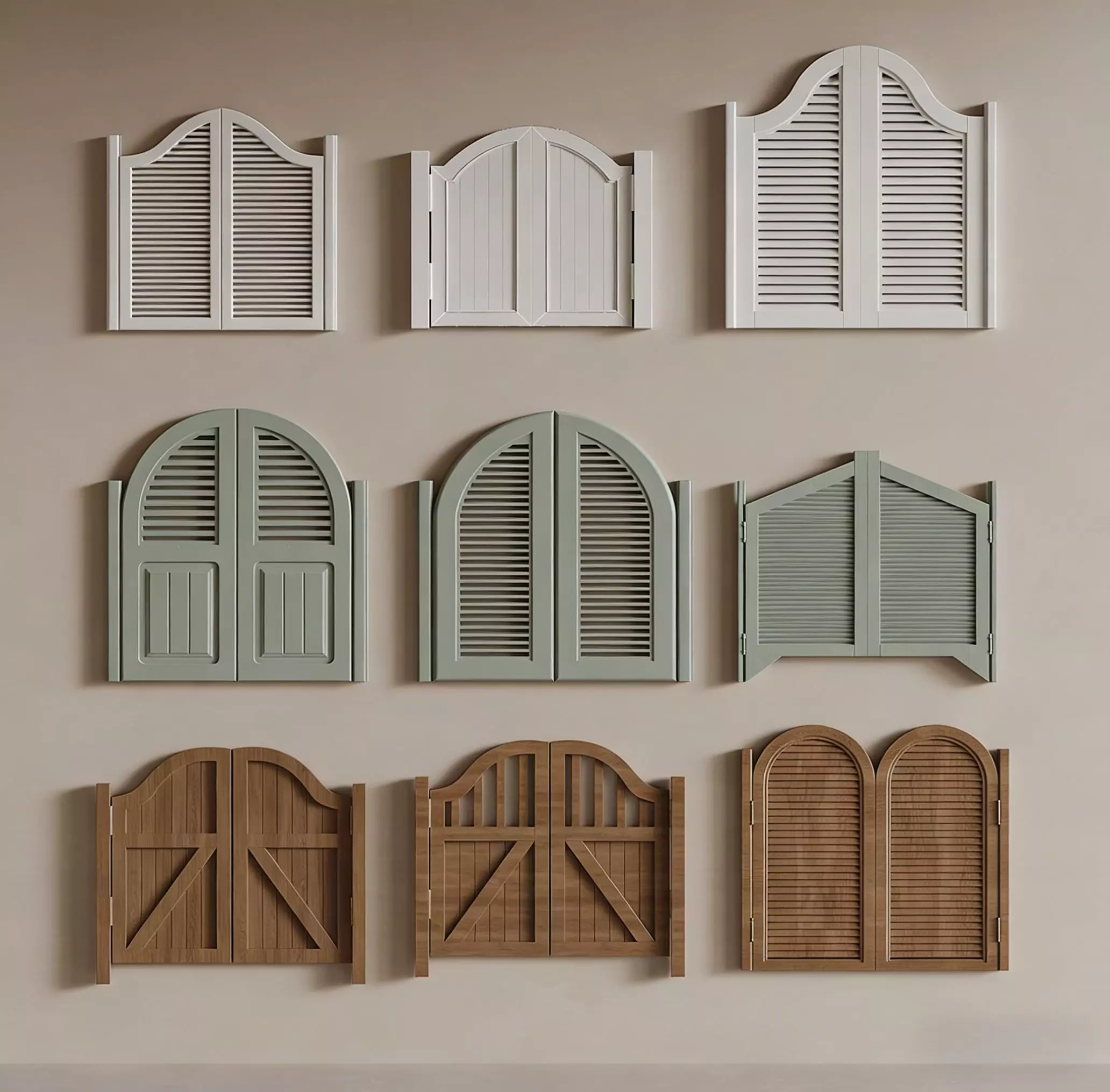 This set of images displays 9 wooden louvered doors/window shutters with distinct designs, neatly arranged in a 3×3 grid, featuring an overall style that leans toward rustic pastoral and French freshness.Color: Available in three main color palettes: white, light sage green, and natural wood brown, with soft, warm tones that suit a variety of home decor styles.Shape: Includes diverse silhouettes such as classic arched tops, straight tops, and sloped tops. Some designs feature louvered grilles, while others are solid wood panels, combining ventilation and decorative functions.Craftsmanship: Made of solid wood with clear natural grain, incorporating techniques like panel joining and diagonal bracing in the details. The texture is natural and rustic, suitable for use as wall decor or functional doors/windows, often used to create a cozy atmosphere for homestays, pastoral-style, or vintage interiors.