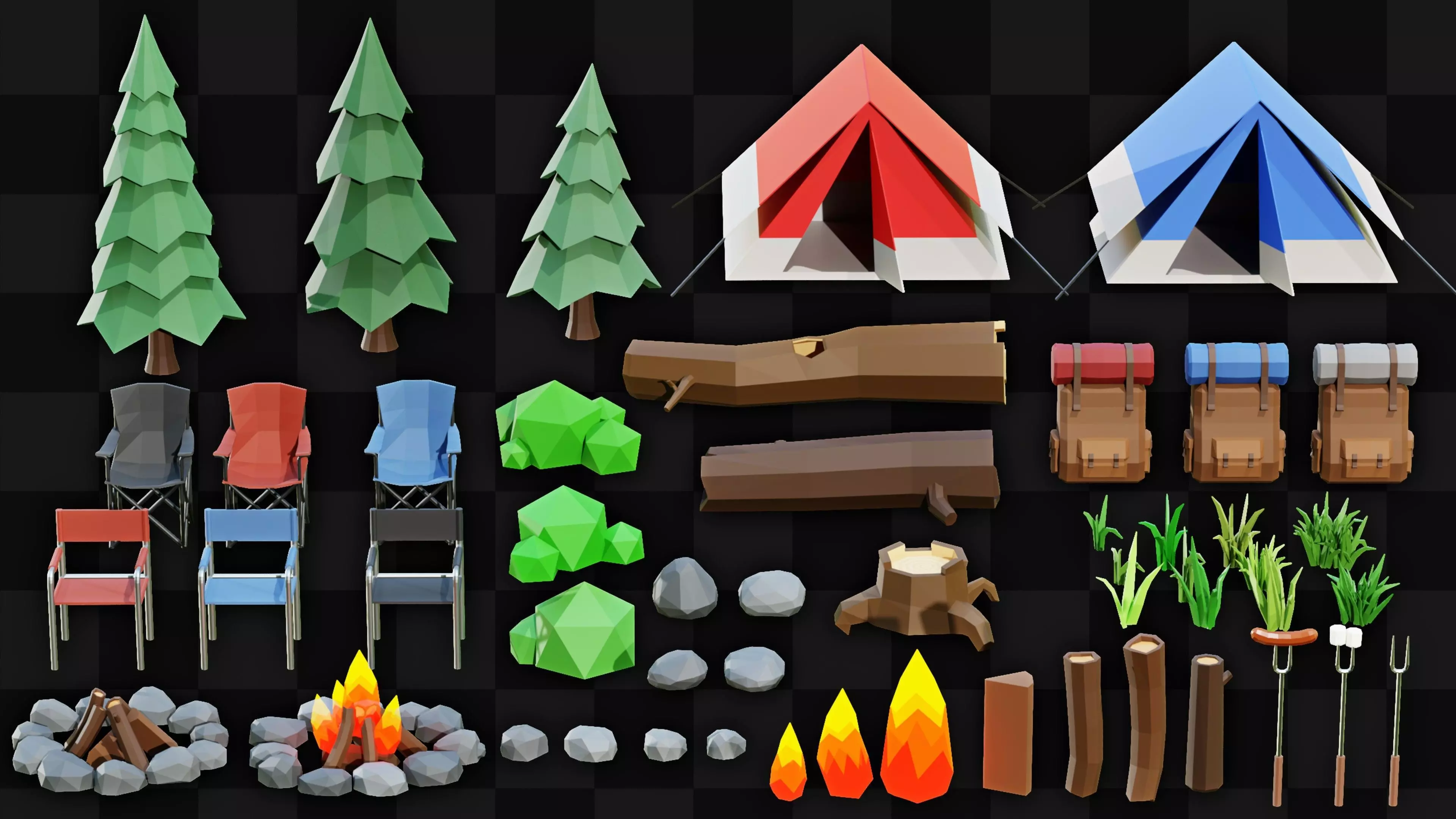 Low Poly Camping Asset Pack created with Blender. The asset pack comes with 52 low poly 3D models.