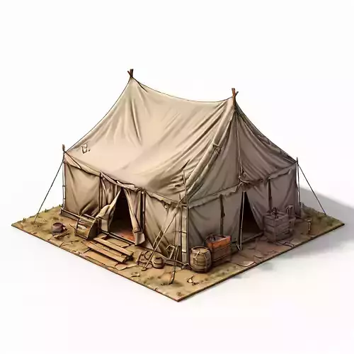 This low-poly 3D model depicts a classic canvas tent complete with various accessories, ideal for game development, architectural visualization, or historical dioramas. It can be used in a range of scenes, from campsites and military encampments to historical recreations and virtual reality experiences. The model is available in several formats including GLB, OBJ, FBX, and STL, catering to diverse software compatibility. Optimized for real-time applications such as games and AR, it features a low polygon count while maintaining essential details. The tent's topology is clean, UV unwrapped for easy texturing, and includes PBR textures for realistic rendering. The accessories, including crates, barrels, and tools, add depth and context to the scene. Whether you are building a sprawling historical landscape or a detailed close-up, this versatile tent model enhances realism and narrative depth.