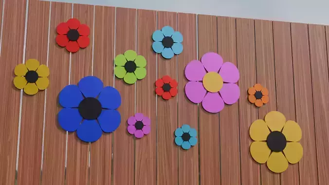 This cheerful metal fence flower display features eleven classic cartoon-style blooms arranged in three different sizes. Each flower has six rounded petals surrounding a raised center, creating a playful, friendly shape that works well in both whimsical and decorative scenes. The flowers come in multiple bright colors, adding variety and charm to the design. All pieces are parented together as a single display for easy placement, but each flower can be separated and repositioned individually as needed. The clean metal construction and simple stylized forms make this set ideal for garden-themed props, outdoor decorations, or any project needing a fun, colorful accent. Lightweight, versatile, and eye-catching, these flowers bring a joyful pop of personality wherever they’re used.